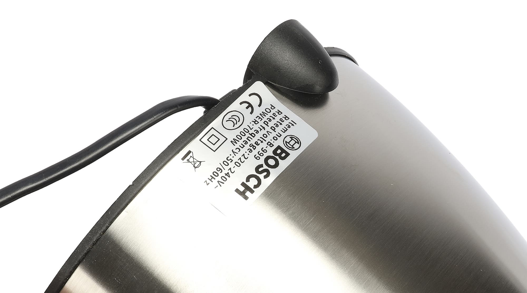 На задней поверхности, противоположной той, где ручка, находится выход шнура питания. Отсека для хранения шнура у прибора нет. Тут же мы обнаружили наклейку с «технической информацией». Очевидно, не совсем соответствующей реальности.