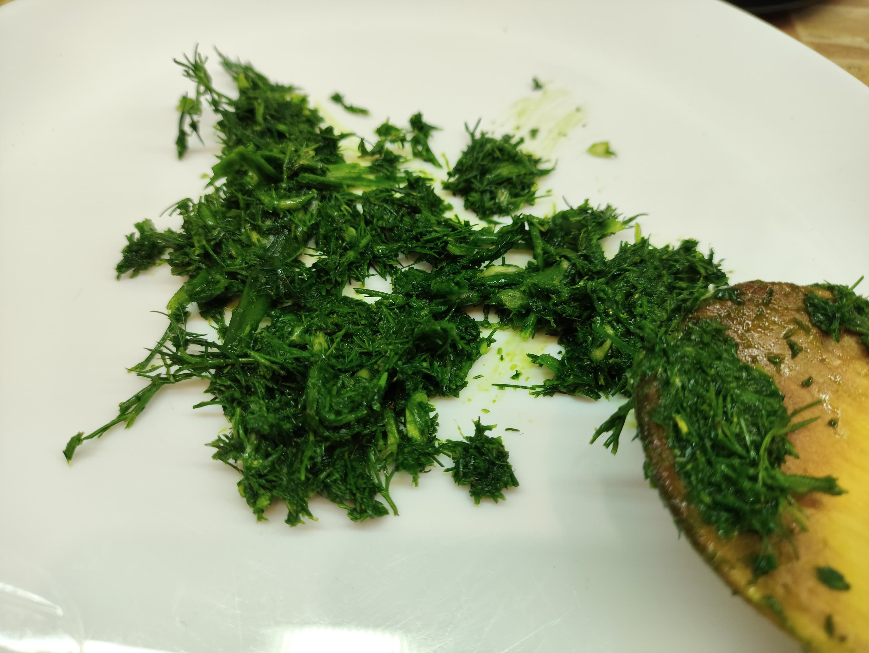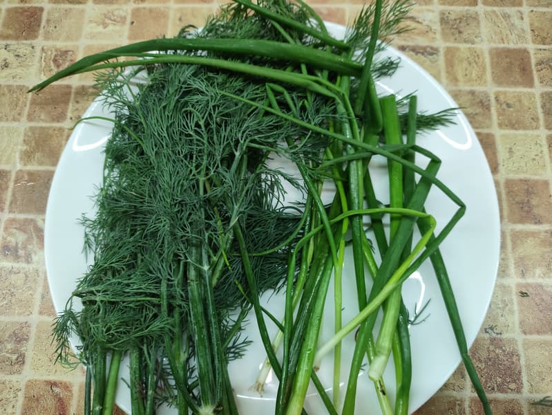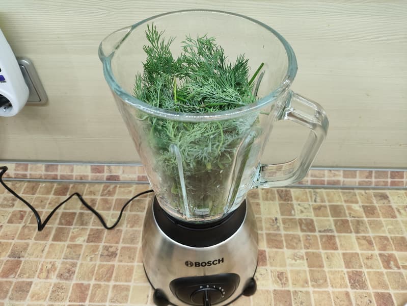 Укроп с луком мы поместили в чашу блендера и приступили к измельчению.