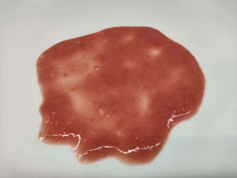 Попытавшись рассмотреть результат подробнее, мы взяли немного томатной жидкости и размазали ее по тарелке.