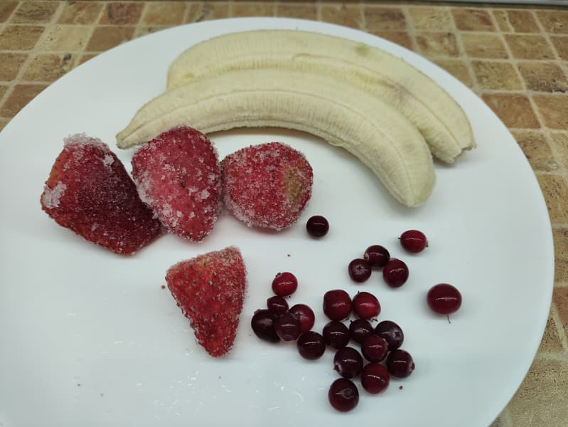 Для приготовления смузи мы взяли бананы, замороженную клубнику и немного клюквы...