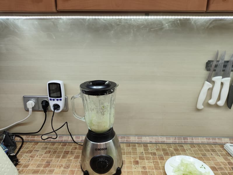 Мы измеряли ваттметром показатели мощности устройства на разных режимах при обработке разных видов продуктов. Так, реверс при колке льда работал на мощности около 100 Вт, потребление прибора составляло 150-210 Вт при обычной нагрузке и до 290 Вт при измельчении «сложных» продуктов. Пиковая нагрузка составила 370 Вт.