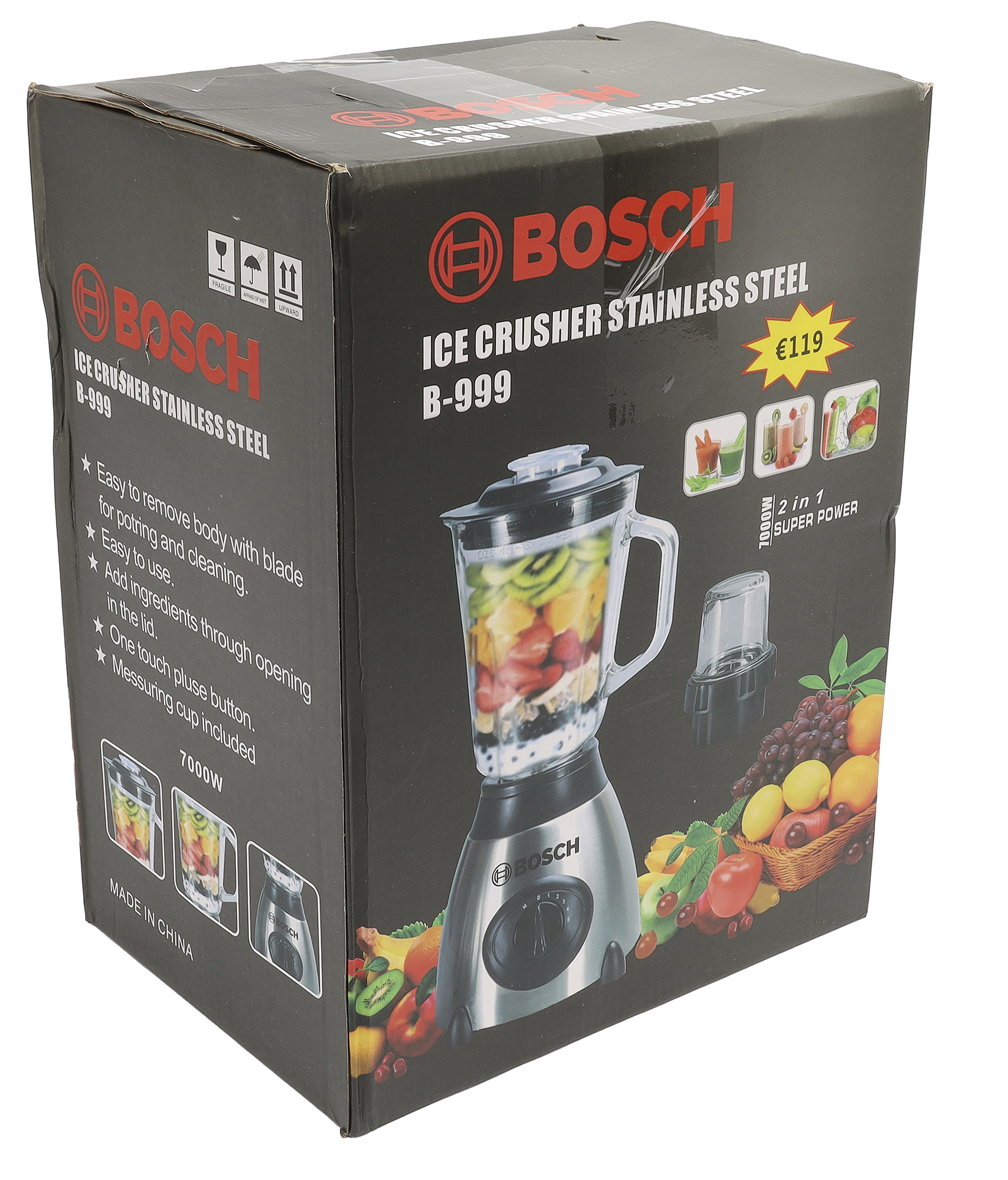 Наш сегодняшний гость — блендер под названием Bosch B-999 с насадкой-кофемолкой и заявленной мощностью в 7000 Вт! Разработчик его называет Ice Crusher, то есть блендер с функцией измельчителя льда.