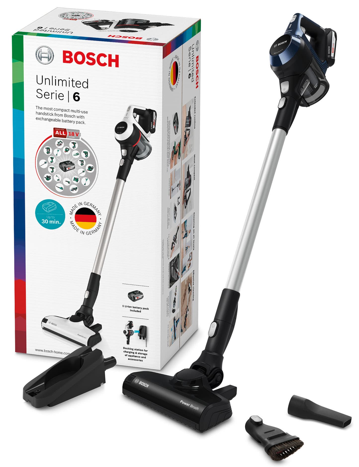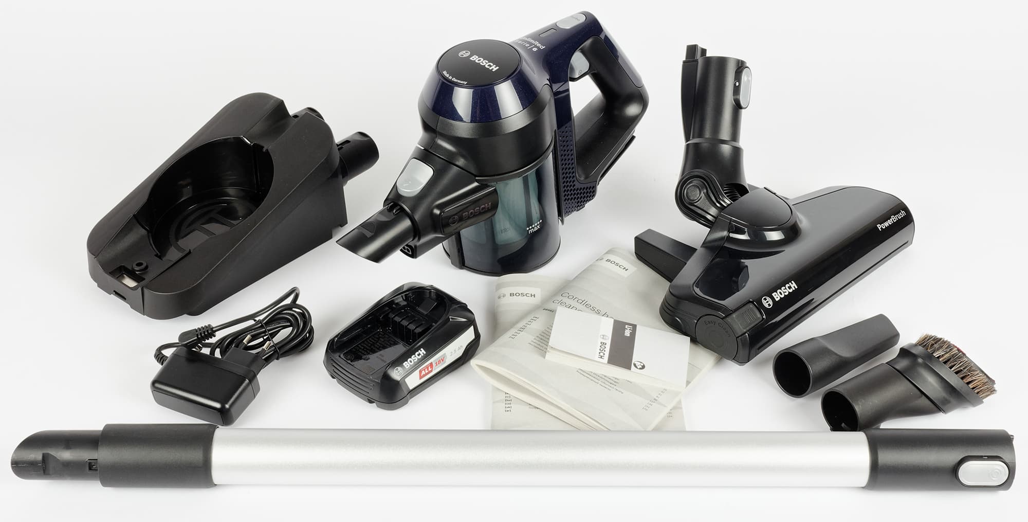 Герой сегодняшнего обзора — вертикальный пылесос Bosch BCS611P4A. Это представитель средней серии аккумуляторных устройств производителя. Устройства Unlimited Serie 6 (артикулы начинаются на BCS61) весьма схожи друг с другом и различаются только комплектацией и элементами дизайна. Объединяют их небольшой вес, компактные размеры и использование единой системы аккумуляторов Power for All 18 В, применяемых во множестве ручных электроинструментов и садовой техники Bosch.