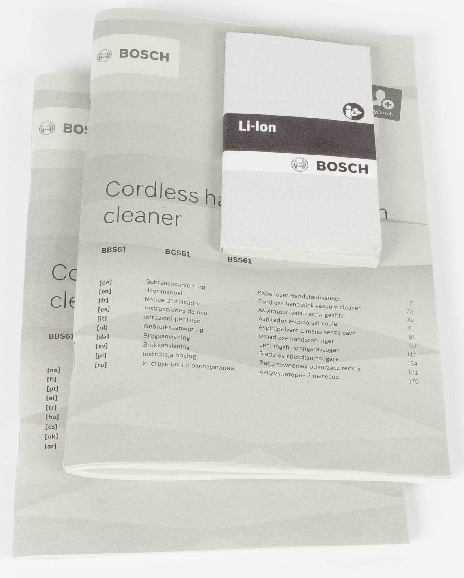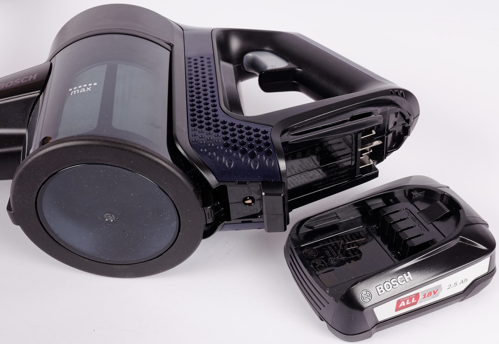 Прилагаемый к устройству блок питания (23,5 В, 650 мА) заряжает аккумулятор не слишком быстро. Но существенное достоинство нашего пылесоса в том, что процесс зарядки можно ускорить более чем в четыре раза с помощью внешнего зарядного устройства линейки Power For All: в Bosch BCS611P4A применяется стандартный аккумулятор, подходящий для электроинструментов, садовой и бытовой техники. Это удобно: такие аккумуляторы широко представлены на рынке, поэтому если в процессе эксплуатации аккумулятор пылесоса исчерпает свой ресурс, даже не обязательно идти в сервисный центр — скорее всего, новый аккумулятор удастся найти в ближайшем строительном магазине.