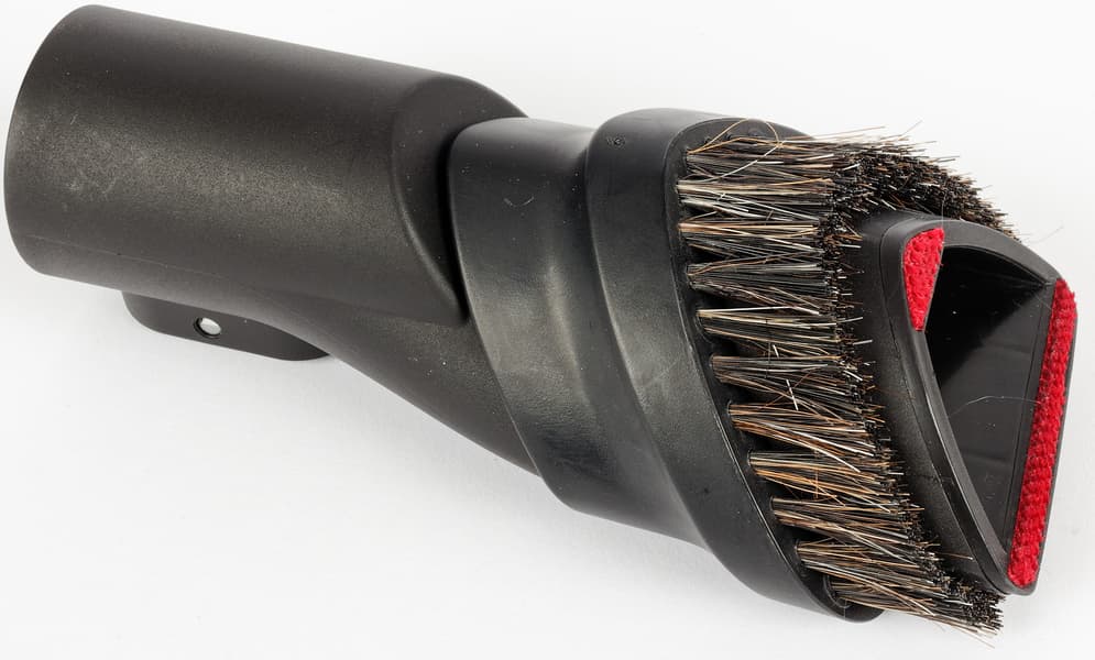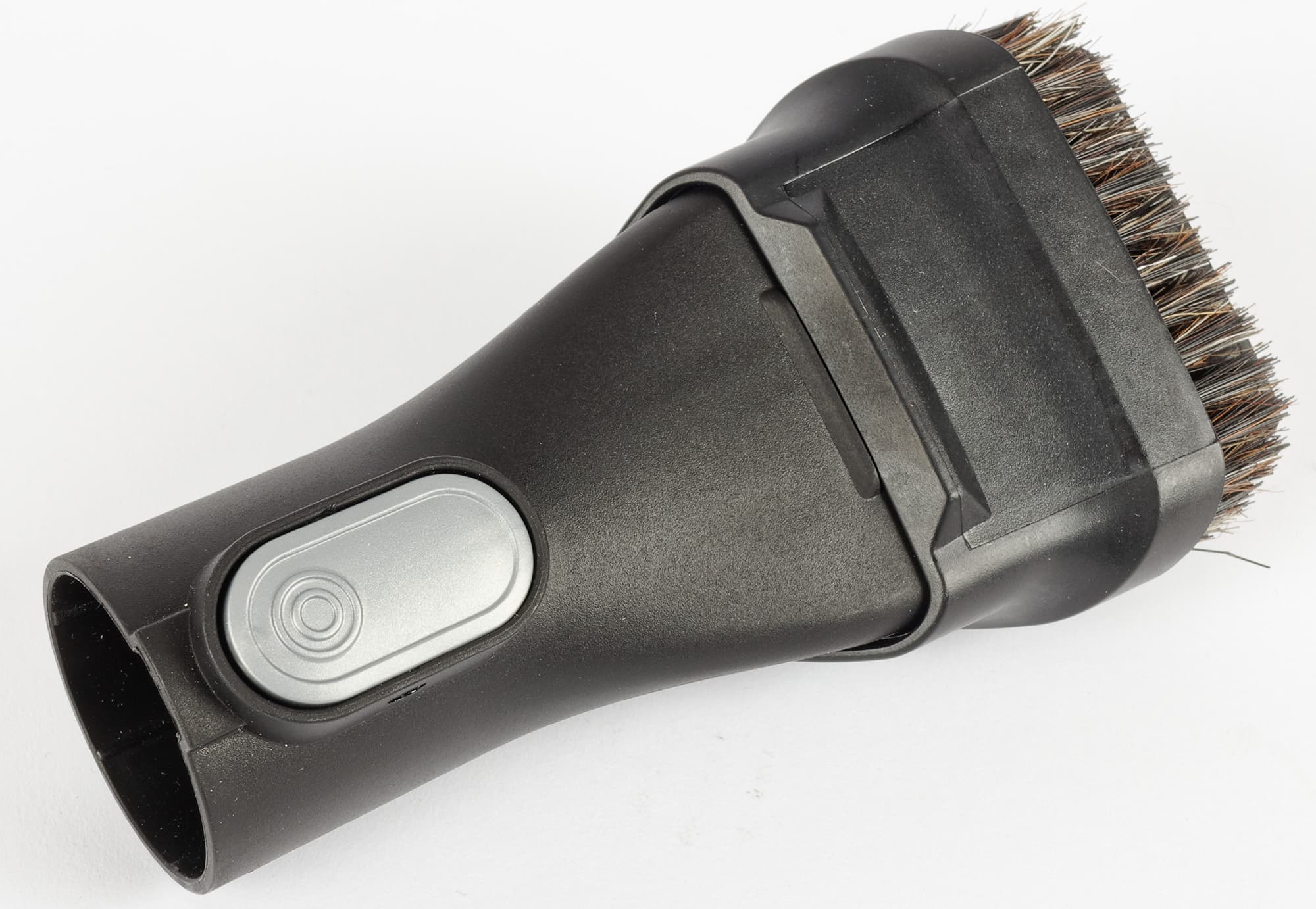 У насадки-щетки, предназначенной для очистки мягкой и корпусной мебели, — натуральная щетина. Когда основная часть с щетинками выдвинута, удобно собирать пыль с корпусной мебели, не царапая ее. Когда основная часть задвинута, можно убираться на обивке мебели. Для этого на торце сопла предусмотрены бархатные насадки, облегчающие скольжение по обивке