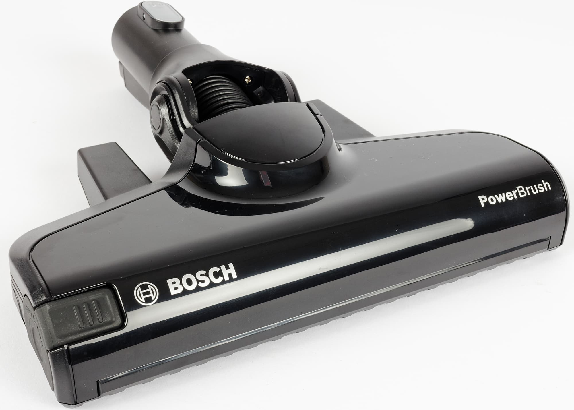 Основная насадка Bosch BCS611P4A — напольная электрощетка PowerBrush. Ее можно присоединить и к удлинительной трубке, и непосредственно к раструбу пылесоса. Шарнирный механизм позволяет ей изгибаться вперед-назад приблизительно на 100 градусов, а вправо-влево — почти на 180°.