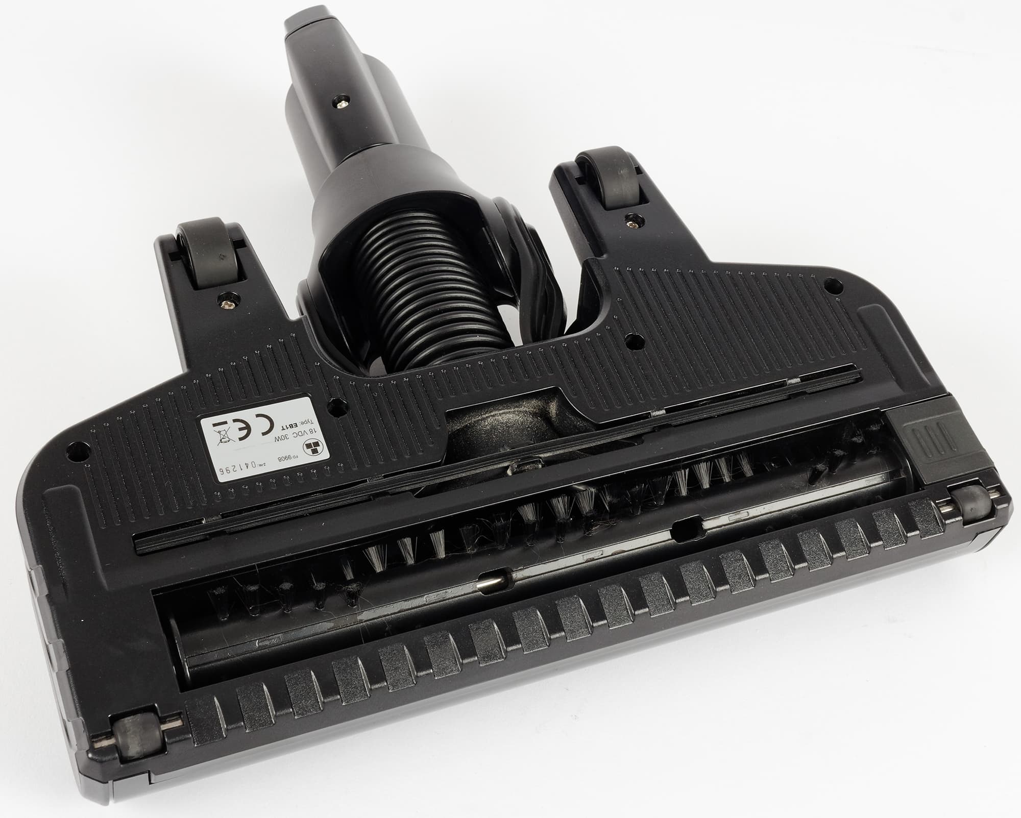 Насадка для полов показала себя эффективной. У ее шарнира достаточная степень свободы для удобной чистки самых труднодоступных мест, а небольшая высота позволяет произвести уборку даже под низкой мебелью на впечатляющую глубину. Звук работы электрощетки при работе практически не слышен: о том, что она действительно вращается, можно догадаться только по незначительному сопротивлению насадки при обратном движении на ковровых покрытиях.
