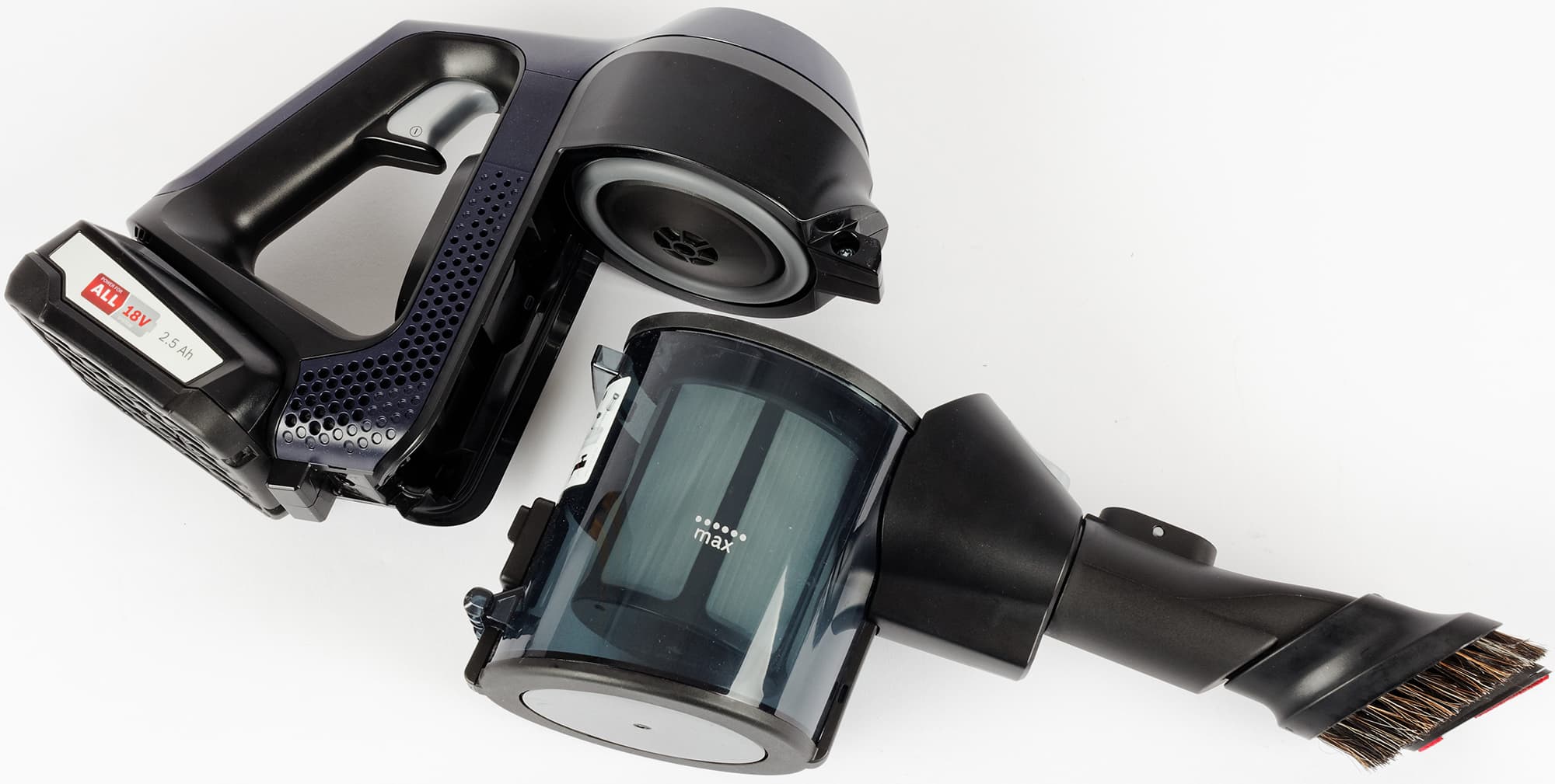 Контейнер для мусора с креплением для насадок и удлинительной трубки полностью отделяется от моторного блока.
