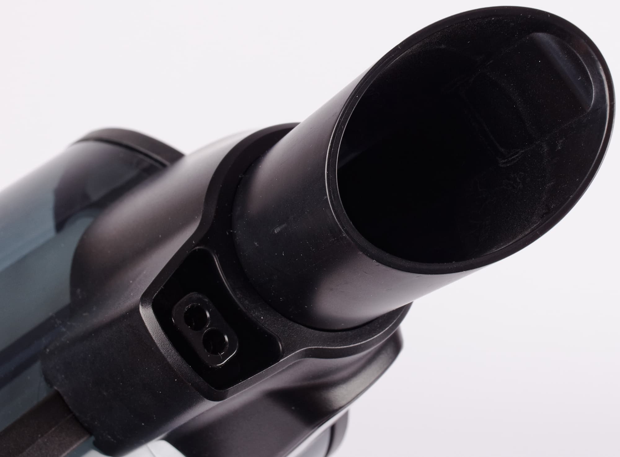 Выходные отверстия моторного блока сориентированы удачно: воздух, выходящий из них, не поднимает вверх неубранную пыль (это довольно распространенная, к сожалению, проблема у некоторых вертикальных электровеников).