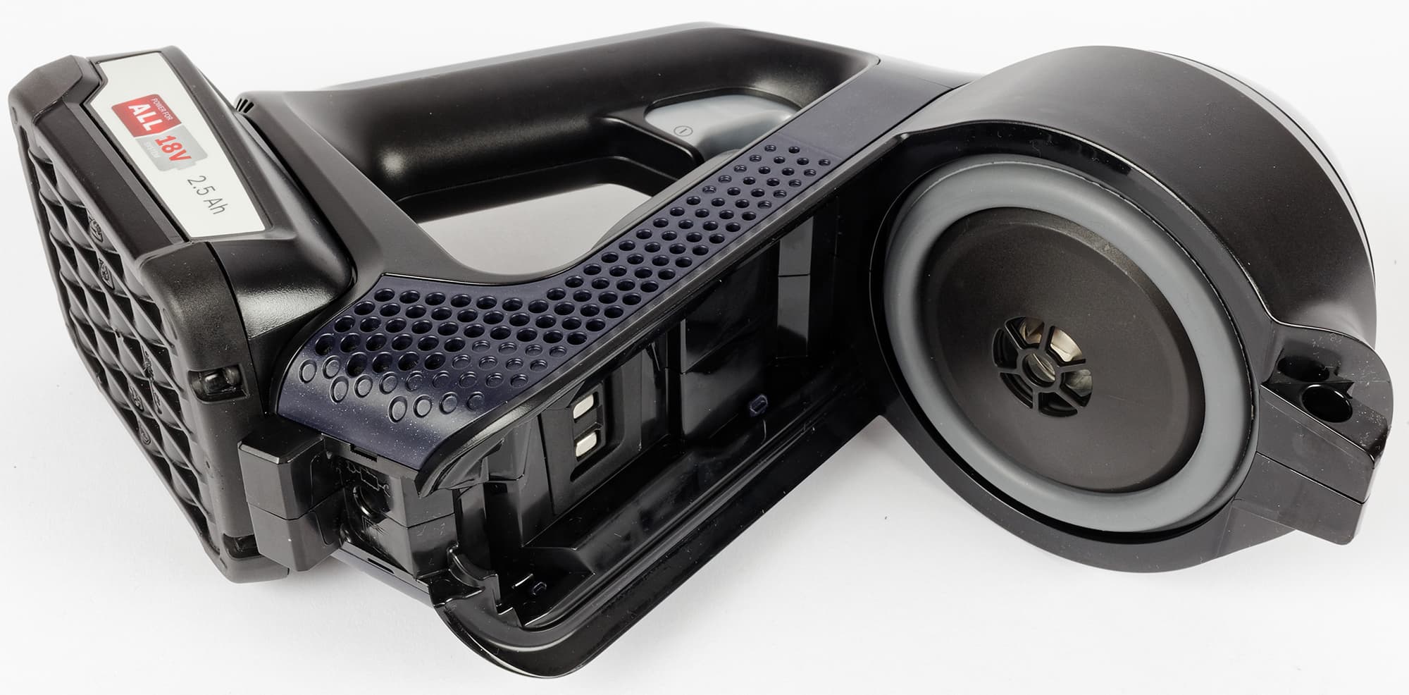Ручка устройства — пистолетного типа со «спусковым крючком» на внутренней стороне. Под ней располагается крепление для 18-вольтового аккумулятора.
