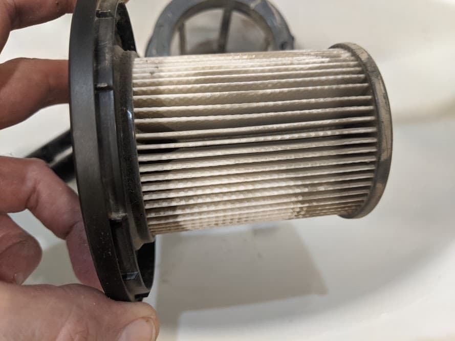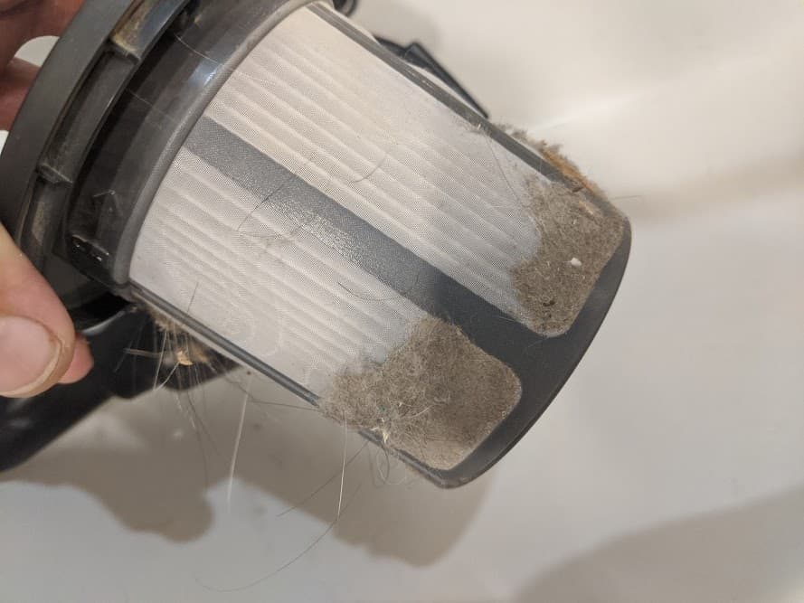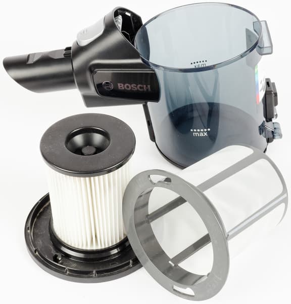 Фильтрующий блок состоит из двух элементов: предварительного фильтрующего элемента из мелкой капроновой сетки и цилиндрического HEPA-фильтра, предназначенного для тонкой очистки. Корпус этой части пылесоса из полупрозрачного пластика серого цвета. Отметки максимального заполнения нанесены на стенки с обеих сторон.