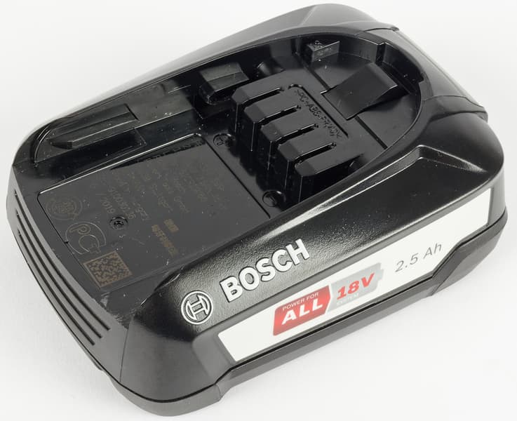Аккумулятор — стандартный для 18-вольтовой линейки Bosch Power For All источник питания на 2,5 А·ч. Два из четырех его контактов служат для подачи питания, а два — для контроля состояния батареи. Средствами визуального контроля заряда аккумулятор не оборудован.