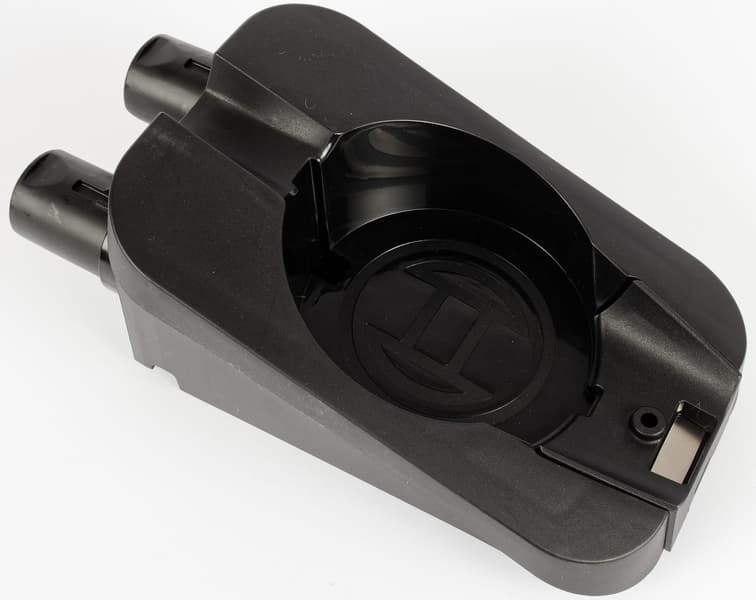 База пылесоса, предназначенная для хранения и зарядки устройства, имеет два крепления для дополнительных насадок и отверстие для подключения зарядного устройства.