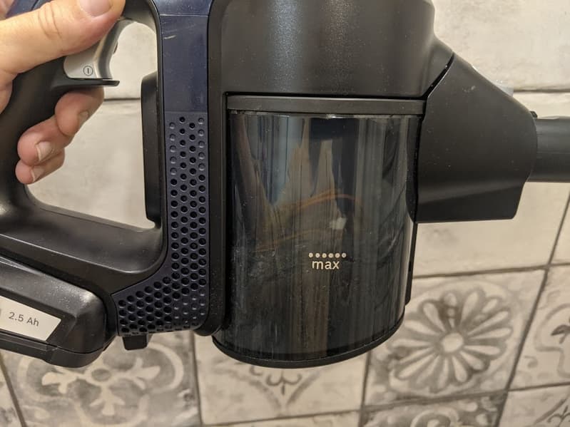 Цвет корпуса пылесборника показался нам не слишком удачным: слишком темный пластик корпуса недостаточно информативен, и уровень мусора в нем виден плоховато.