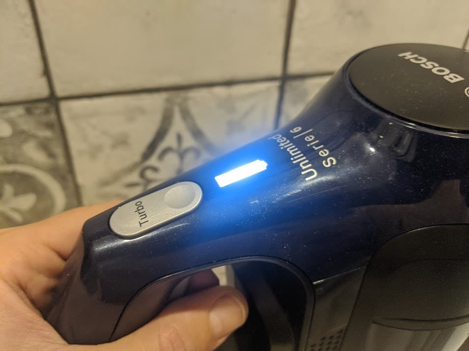 Когда аккумулятор разряжается до определенного предела, индикатор загорается красным светом. Забавно, что оценка его емкости относительная: пылесос, включивший красный свет в турбо-режиме, можно переключить на нормальную мощность. Индикатор сменит цвет на белый, и уборку можно продолжать еще несколько минут.