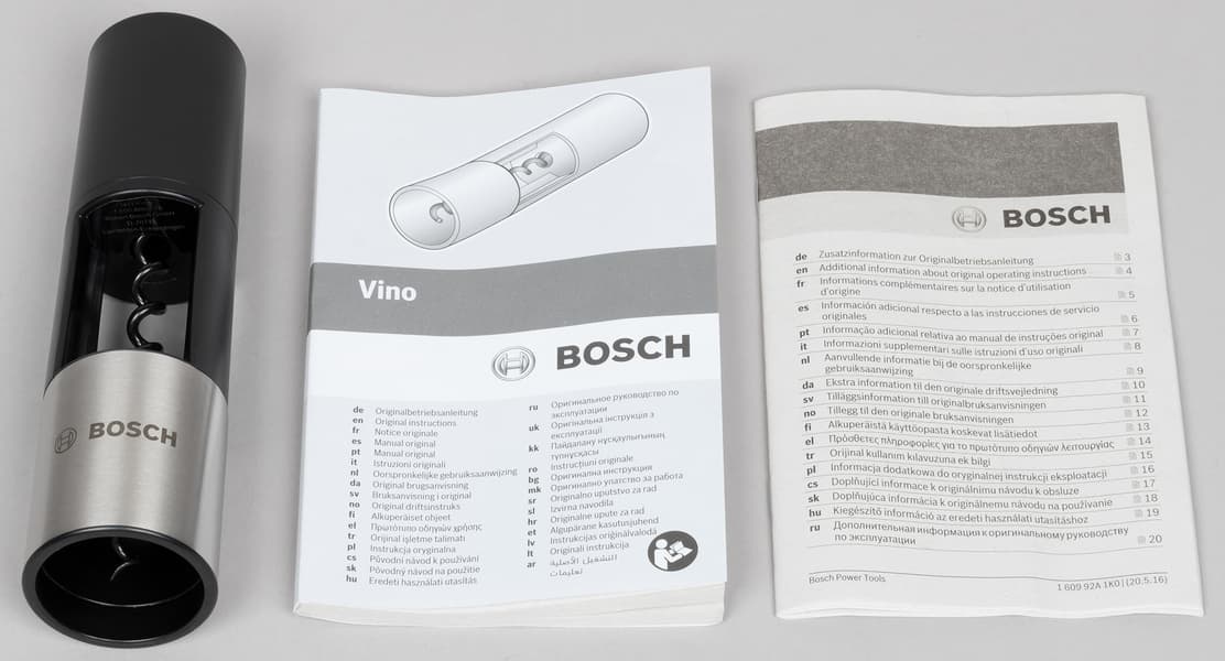 16-язычная книжка-инструкция содержит 250 страниц, немалая часть часть информации посвящена перечислению сертификатов и мерам по технике безопасности, как это теперь принято. Однако нашлось место и для полезных сведений: здесь приведены полные технические характеристики прибора, данные по шуму и вибрации. Довольно подробно расписан процесс зарядки аккумулятора и методы монтажа насадок.