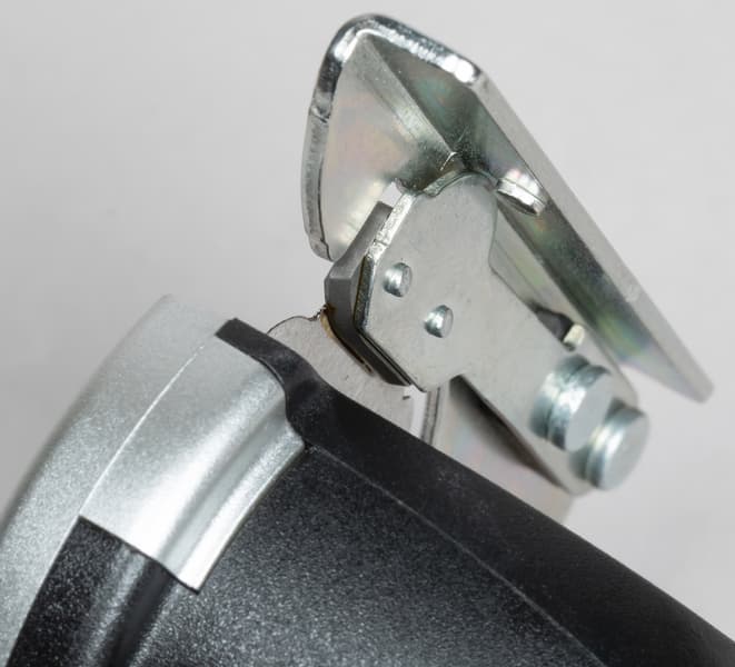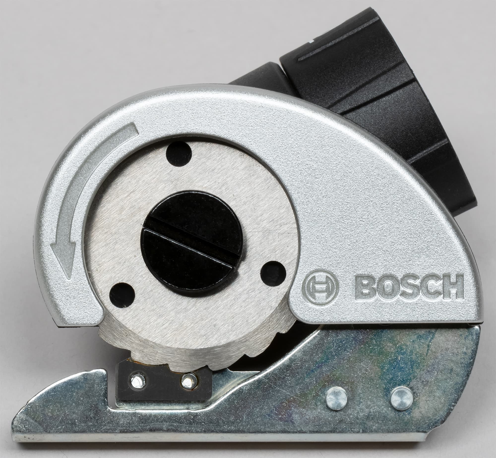 Конструкция насадки состоит частично из металлических, частично из пластиковых деталей, первые соединены заклепками, вторые — болтами. Внутри спрятан редуктор, который передает вращение режущему диску. Кстати, этот диск при вращении постоянно самозатачивается — для этого к нему прижата металлическая подпружиненная пластинка. Эта же пластинка играет роль второго лезвия ножниц.