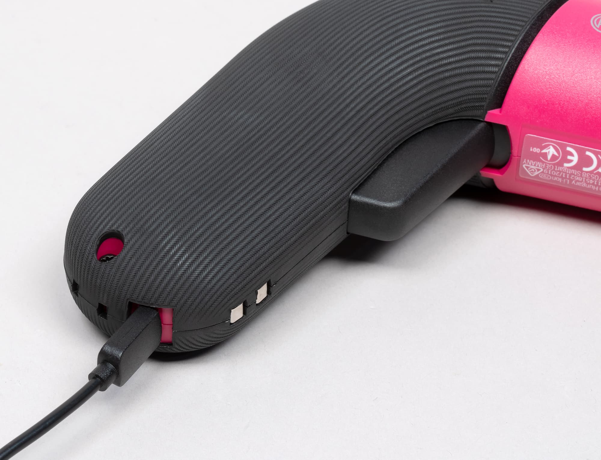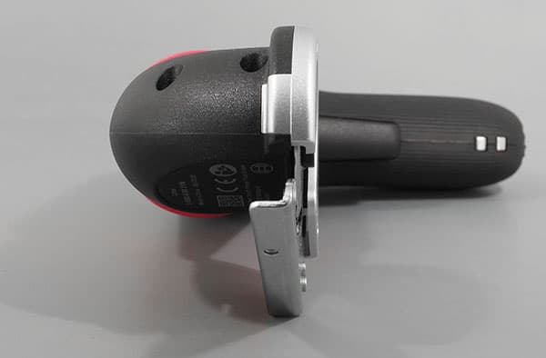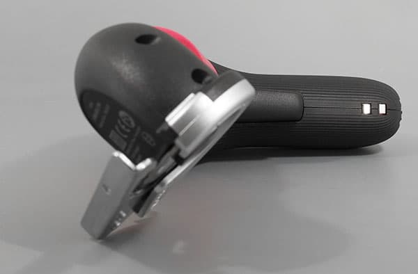 Переключение диапазонов скоростей у нашей отвертки-гайковерта-шуруповерта отсутствует. Изменение скорости вращения шпинделя производится нажатием на главную кнопку-рычаг, которая утапливается на 11 мм. Для подзарядки аккумулятора в торце рукояти имеется порт Micro-USB. Также на рукоятке можно видеть два стальных контакта. Они могут пригодиться при использовании зарядной док-станции, которая приобретается отдельно.