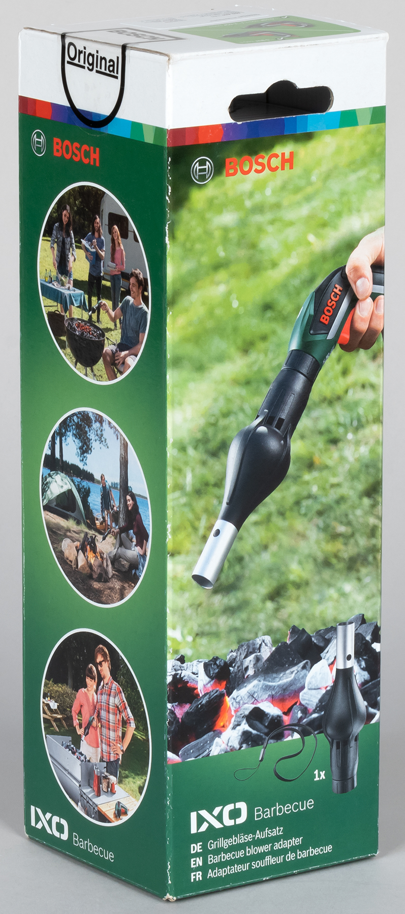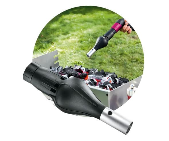 Учитывая, что у нас уже имеется электроштопор, эта насадка не менее злободневна. Поскольку жидкий продукт, для доступа к которому требуется штопор, принято закусывать. Иногда. Бывает, что даже закусывать мясом. Которое сначала нужно приготовить. На углях, например. А углям для горения требуется кислород, который можно подать только наддувом. Вот такая логическая цепочка.