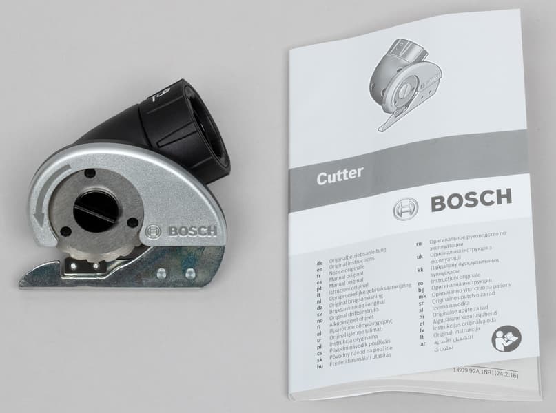 Из этой книги можно почерпнуть довольно полезную информацию. В частности, о материалах, для разрезания которых предназначена насадка. Это пластик (ПВХ), картон, кожа или ткань. Важно: толщина обрабатываемого материала не должна превышать 6 мм. Причина понятна: диаметр режущего диска невелик, и для контроля толщины материала на входе в режущую зону предусмотрен ограничитель.