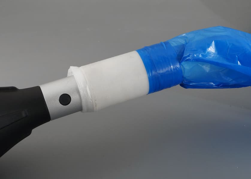 Так мы и поступили. Взяв 60-литровый мешок, загерметизировали его открытую сторону липкой лентой, а трубку, через которую будет поступать воздух, намертво прикрутили изолентой (классической синей).