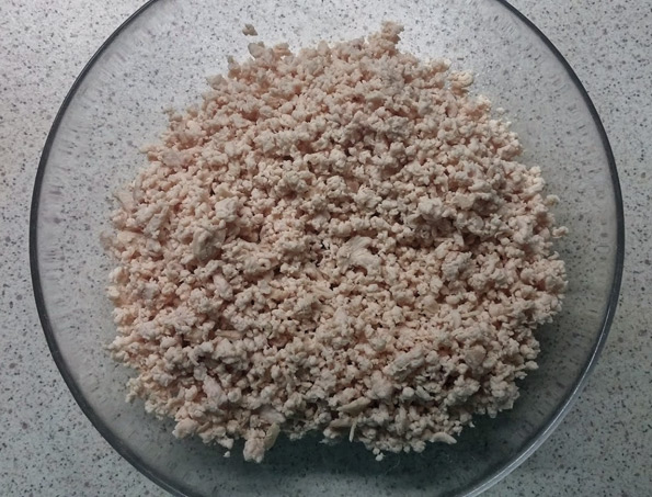 В нашем холодильнике лежало два отварных куриных филе общим весом в 700 г. И были они жесткими и непривлекательными. Мы решили пустить их на начинку для фаршированных баклажанов. Установили ножи из нержавейки внутри чаши комбайна и включили прибор на максимальную скорость.