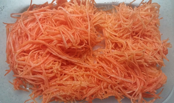 Результат: отлично. Морковка была натерта очень тонко и более чем профессионально. Причем, как и в случае с салатом из редьки, жмыха и необработанных кусочков поверх насадки не осталось вовсе. У нас получился отличный завтрак (если притвориться, что мы ведем здоровый образ жизни).