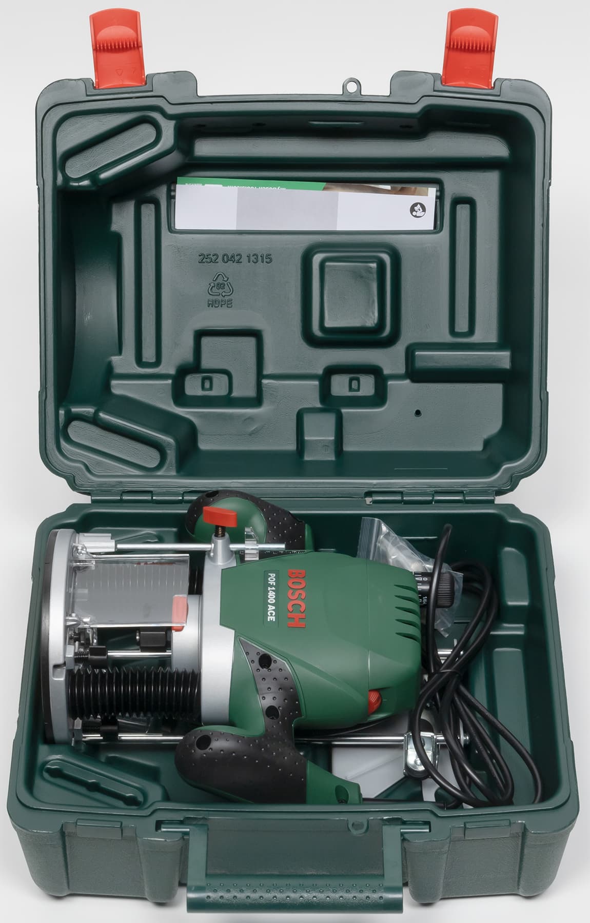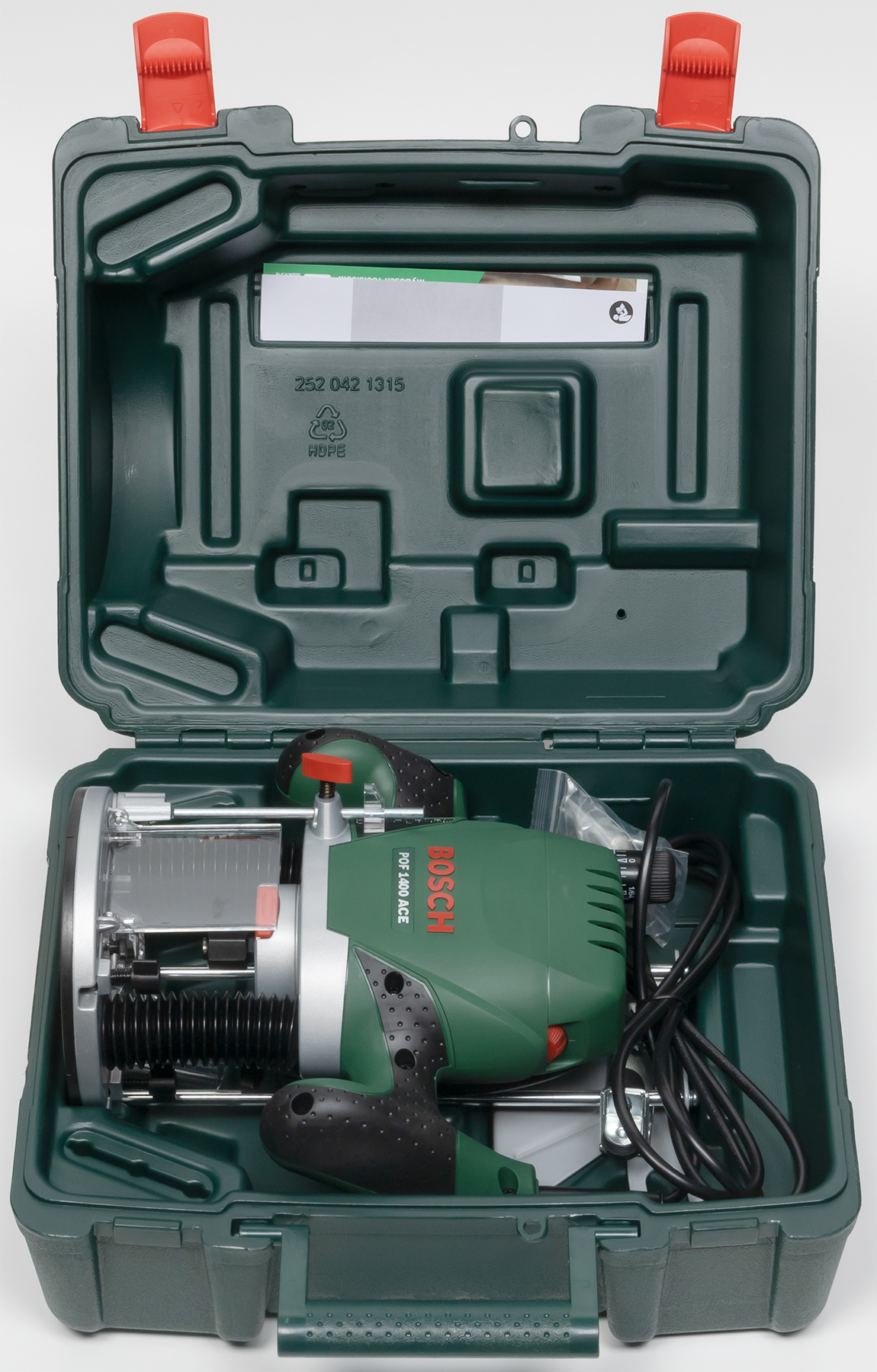 Инструмент в собственном пластиковом домике — это круто. А если кейс продуманный и компактный — вдвойне удобно. Тут даже кармашек имеется, специально для хранения руководства пользователя, а дополнительная деталь — параллельный упор — и вовсе привинчен барашковой гайкой. Также здесь присутствуют углубления для хранения шести дополнительных фрез, которыми любой владелец фрезера непременно обзаведется. Не сразу, конечно. Со временем.