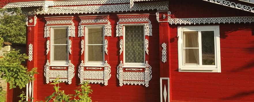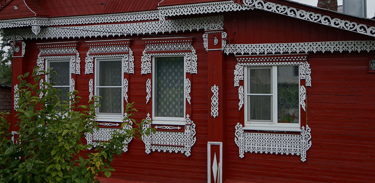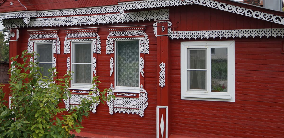 Как можно видеть, все наличники тут — прорезные (пропильные или сквозные). А вся резная конструкция, которая крепится поверх окна, называется накладной, поскольку отдельно вырезанные небольшие детали закрепляются на контрастной основе (такой основой иногда может являться крашеная стена дома).