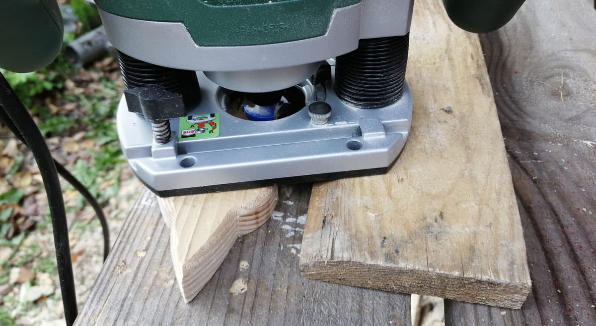 В ролике можно видеть, что машина покачивается во время фрезерования. Верно, наша ошибка, не позаботились о дополнительной опоре, на которую должна опираться подошва. В качестве такой опоры можно использовать обычную доску той же толщины (высоты), что и обрабатываемая деталь. Просто положить ее рядышком, вот так.