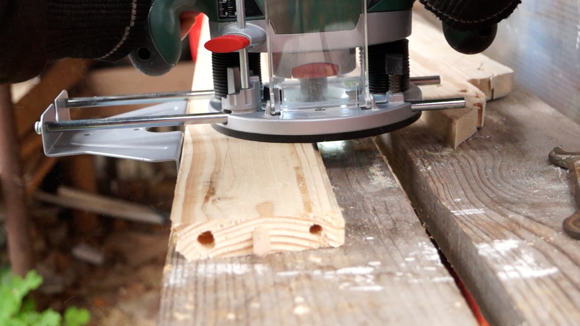 Вообще, главное при работе с фрезерной машиной — крепкие руки. Если какую-нибудь дрель не возбраняется держать одной рукой, то с фрезером такой фокус не пройдет. Взялся за рукоятки — лучше навалиться всем весом, иначе фрезу непременно уведет в сторону, даже если пользуешься жестким шаблоном или ведешь фрезер вдоль направляющей.
