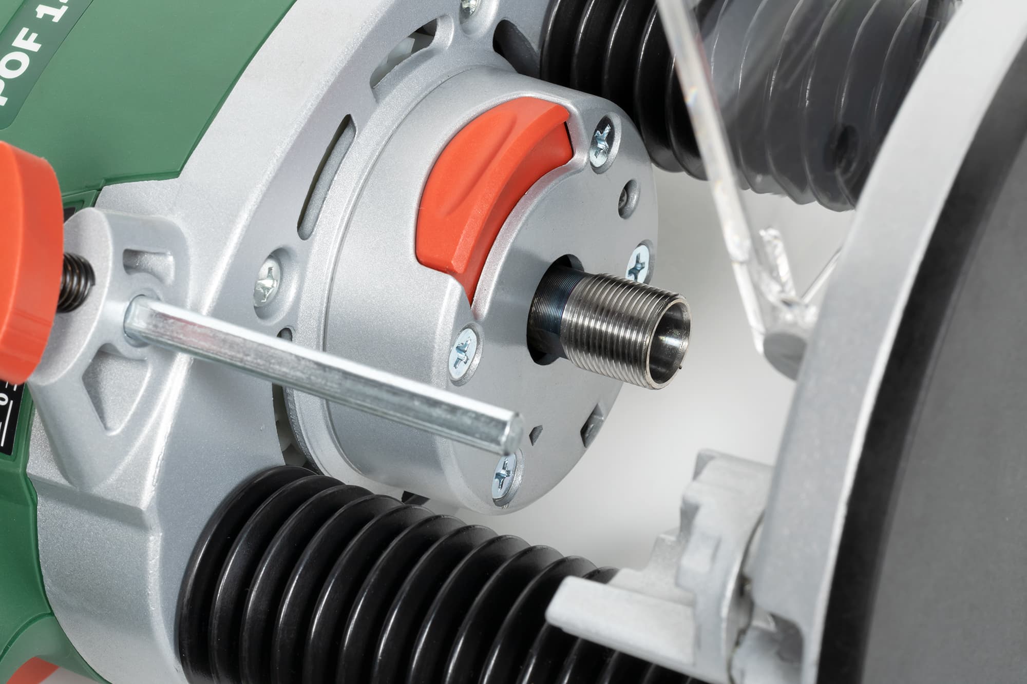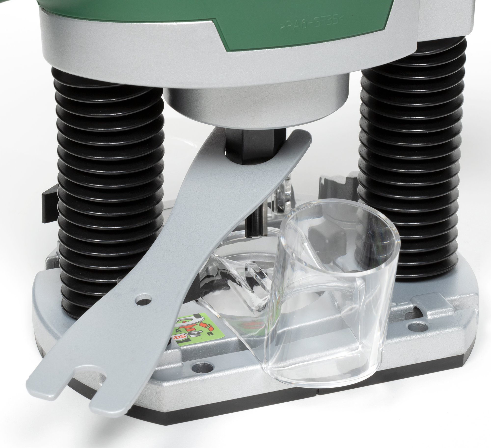 Человеку, который не знаком с таким типом инструмента, конструкция ручного вертикального фрезера может показаться нелепой. Но она продиктована самим назначением машины: двигатель, расположенный сверху, опирается на две подпружиненных опоры, закрытые гофрированными манжетами. Опоры, в свою очередь, покоятся на пластине с плитой скольжения (и то и другое — литье, а не какая-то там штамповка). Наконец, два уха по бокам — это не ухи, а рукоятки, чтобы удерживать машину обеими руками.