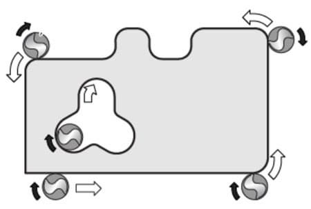 Еще одна особенность работы, о которой необходимо постоянно помнить: при обработке кромок машину вести следует строго против направления вращения фрезы. Черными стрелками показано направление вращения фрезы, а стрелками белого цвета — направление, в котором следует вести фрезер.