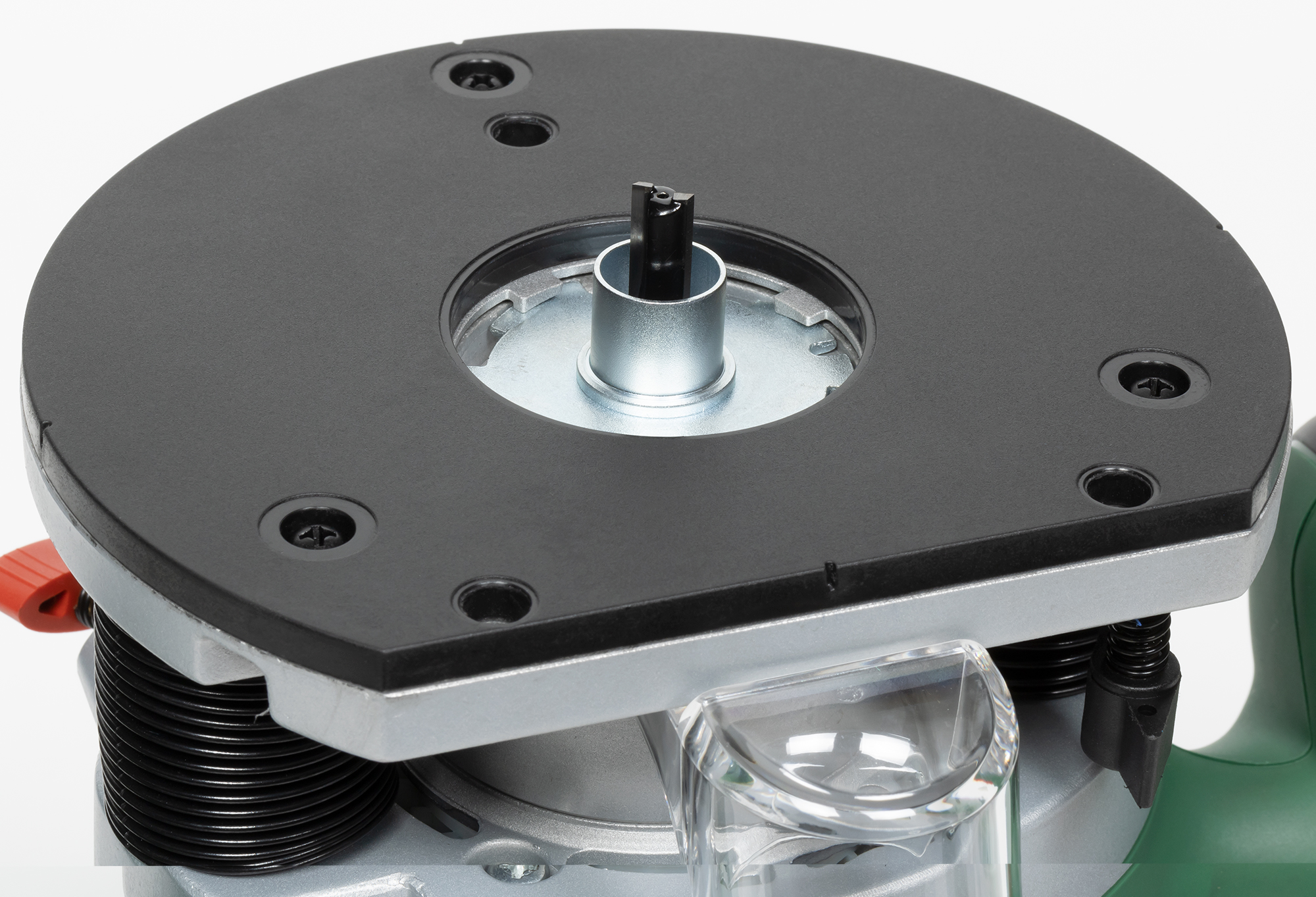 Максимальный диаметр фрезы, который можно использовать с данной машиной, составляет 50 мм, а глубина хода варьируется в пределах 55 мм. Комплектная съемная копировальная гильза (иначе — втулка) вставляется в подошву и фиксируется сдвижным подпружиненным рычагом.