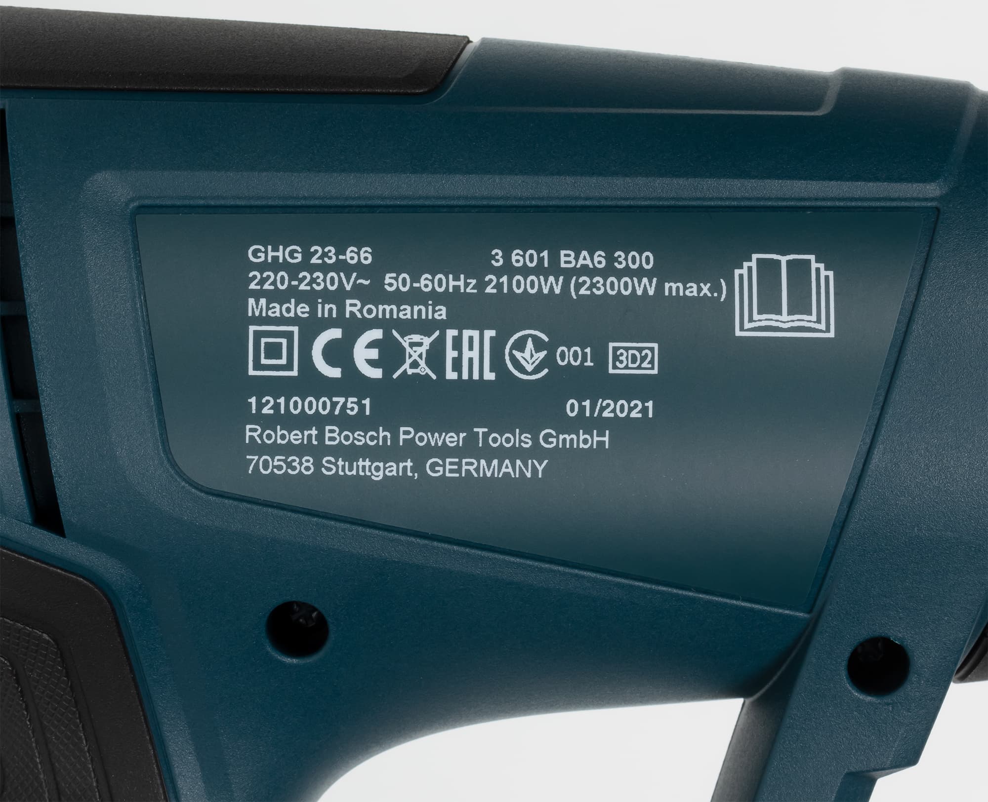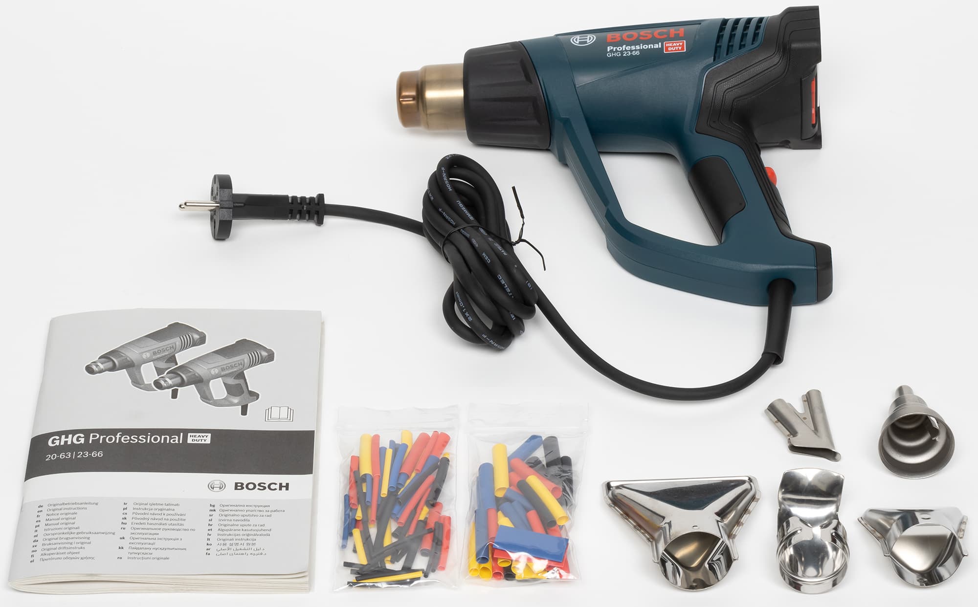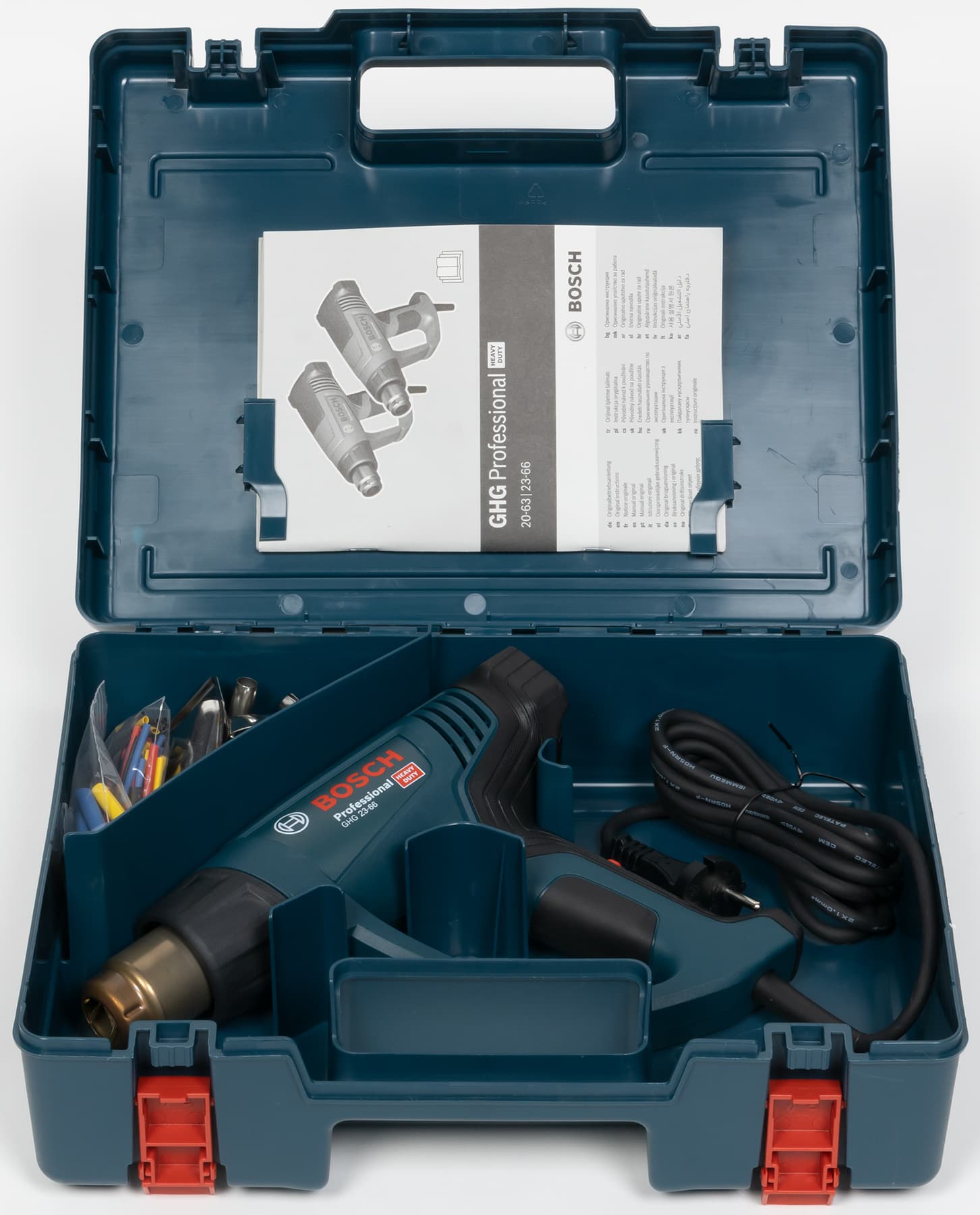Никакой тесноты внутри чемоданчика нет, поэтому пользователю не придется долго укладывать инструмент и принадлежности после работы. Фен фиксируется на месте пластиковыми выступами, а контур фена на днище подскажет, как фен нужно укладывать. Чего-то специального для укладки шнура нет, он просто смотан в бухту и перетянут проволочной стяжкой — нет даже многоразовой стяжки с липучкой. В отдельном отсеке в кучу свалены принадлежности. Места там достаточно еще для нескольких насадок. Так же что-то можно побросать в отсек с феном. Инструкция традиционно закреплена на крышке изнутри. Инструкция многоязычная, есть раздел на русском языке. Качество полиграфического исполнения высокое, но бумага самой тетрадки чуть толще папиросной. Инструкцию можно загрузить с сайта производителя в виде файла PDF. Информации в инструкции довольно много, в частности описаны функции инструмента, а также примеры возможных работ с использованием насадок из комплекта и парой других. Есть небольшое неудобство в том, что инструкция относится также к другой модели (GHG 20-63), поэтому в паре мест нужно выбирать то, что относится именно к GHG 23-66. Комплектация богатая: целых пять насадок и два набора термоусадочных трубок.
