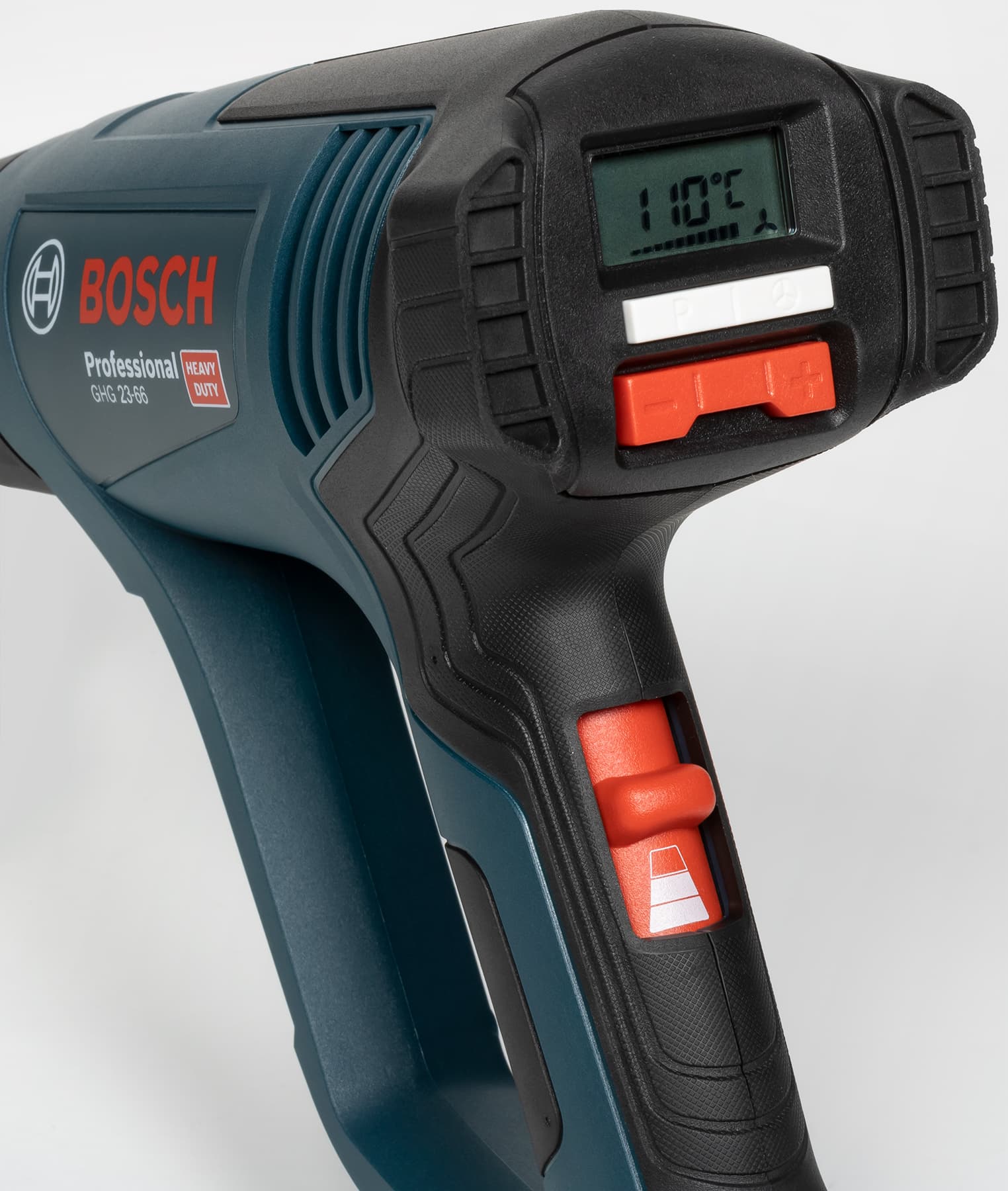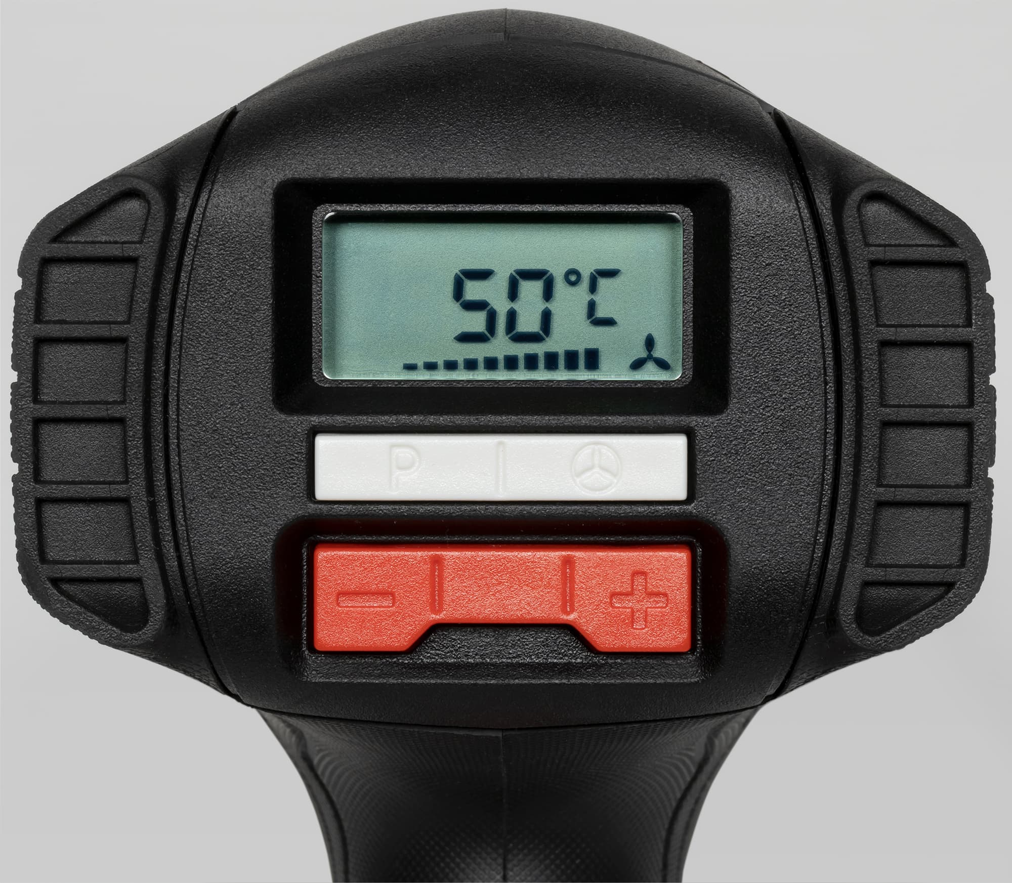 В нижнем положении переключателя фен выключен. В среднем положении температура зафиксирована на 50 °C, а менять можно только скорость воздушного потока в пределах от 150 и только до 300 л/мин. Этот режим можно использовать для высушивания чего-то и для охлаждения фена после работы на высокой температуре. В верхнем положении переключателя можно менять оба параметра. Для изменения температуры нужно нажимать на стороны плюс и минус двухпозиционной красной кнопки. При этом удерживание включает режим быстрого изменения настройки температуры. В процессе настройки задаваемая температуры отображается на ЖК-дисплее. После выставления нужной температуры, выводится фактическая температура, а значок градусов мигает, пока температура не достигнет заданного значения.