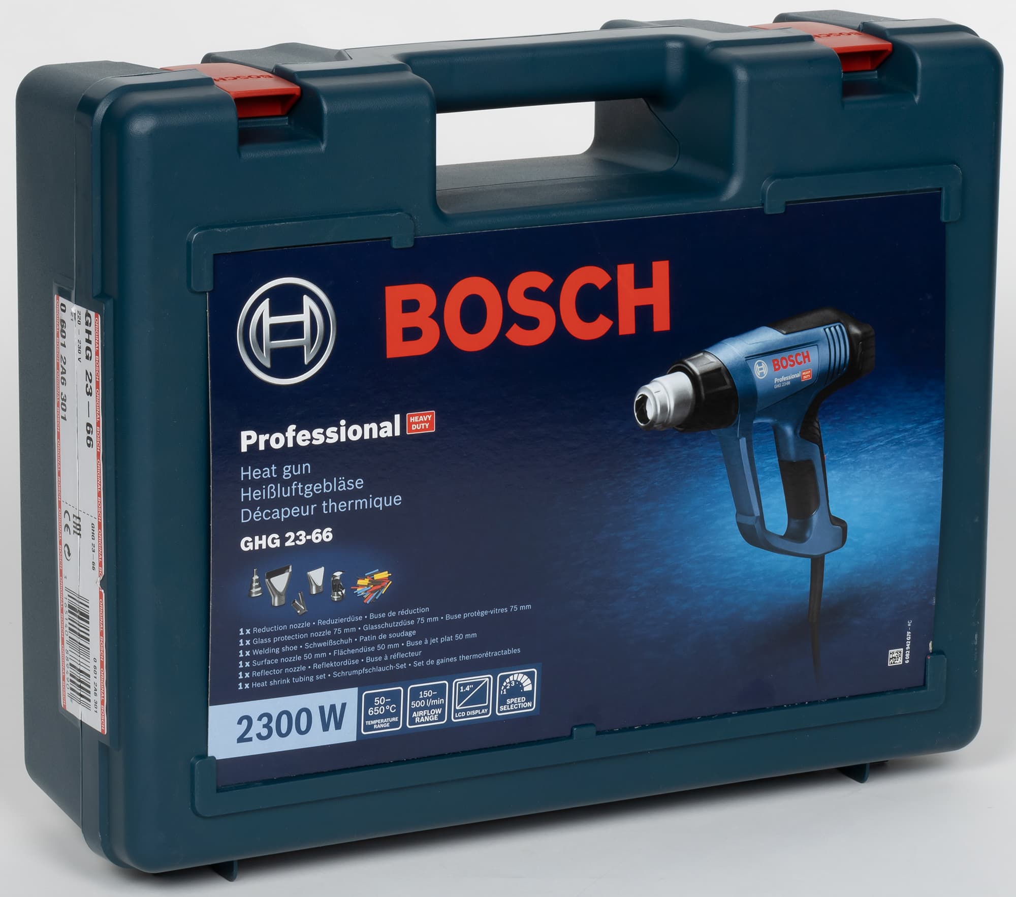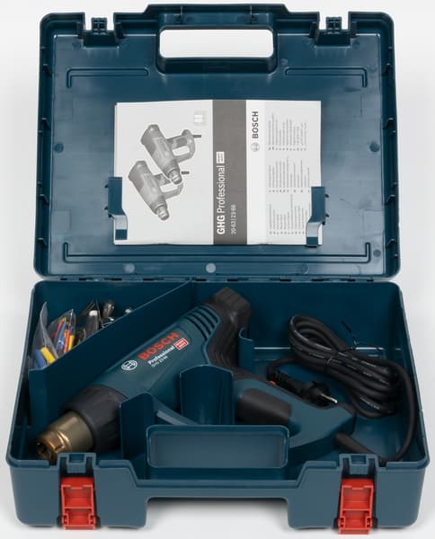 Итак, что же получает покупатель технического фена Bosch Professional GHG 23-66, переплатив раз в 10 по сравнению с «обычным» феном? Прежде всего это отличный чемоданчик для удобного хранения фена и аксессуаров. Нет, конечно, прежде всего это качество и надежность «синего» Bosch. Затем отличная функциональная оснащенность: многоступенчатая регулировка температуры и воздушного потока, четыре ячейки памяти для сохранения комбинаций температуры и потока воздуха, плюс сохранение последних значений установок. Важным моментом является хорошая стабильность поддерживаемой температуры и небольшое расхождение между заданной температурой и измеренной. Далее стоит отметить отличную комплектацию, в частности комплект насадок для сварки пластика/линолеума. Вот теперь настала очередь чемоданчика.