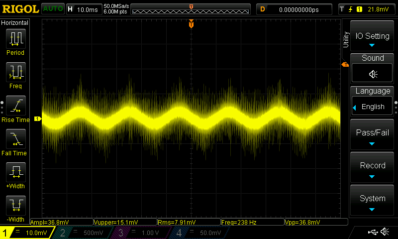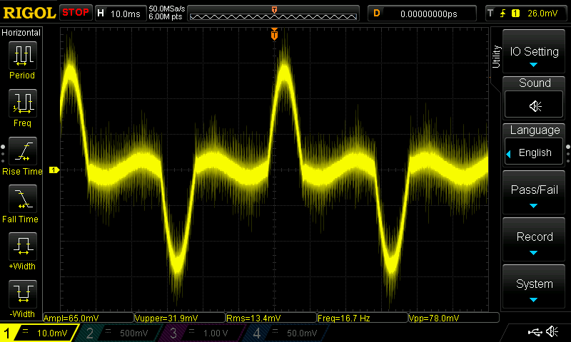 Видны ожидаемые пики на 50 и 100 Гц, что соответствует частоте сетевого напряжения, средне-высокочастотный горб, обусловленный, видимо, движением воздуха, и пик жужжания мотора, частота которого растет по мере увеличения скорости вращения мотора.