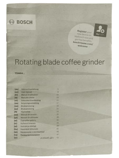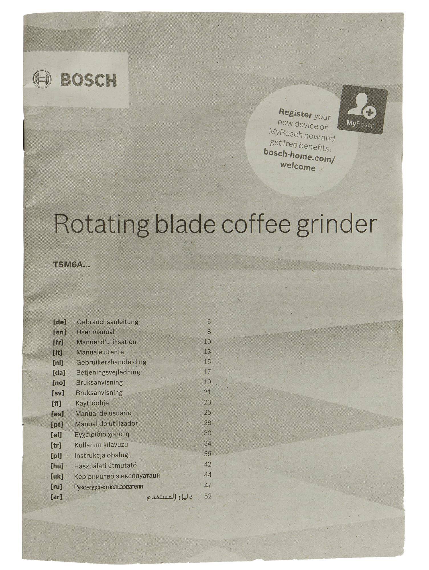 Вообще, документ более чем лаконичен. На первых страницах в графической форме представлено устройство прибора, правила его эксплуатации и ухода. Изучение руководства по эксплуатации займет буквально пару минут, после чего о нем можно забыть навсегда. Самое интересное в нем — это рекомендуемое время помола определенного веса кофе. Впрочем, и это довольно быстро выясняется опытным путем. В инструкции ничего не говорится о возможности использовать кофемолку для измельчения других подходящих продуктов — специй, орехов, сахара.