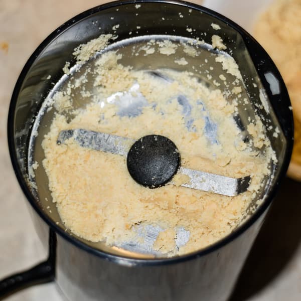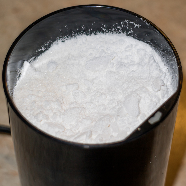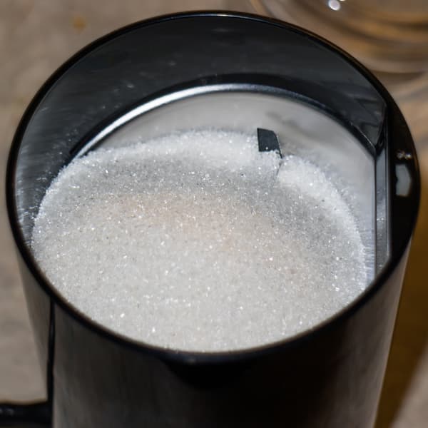 Измельчали сначала импульсами. Периодически встряхивали кофемолку, чтобы сахар не спрессовался и не слипся от трения лезвий. Всего работали 15 секунд.