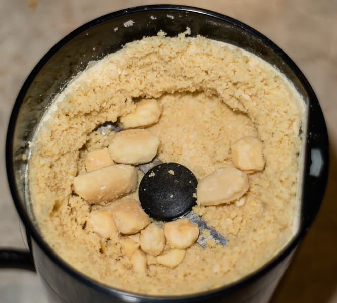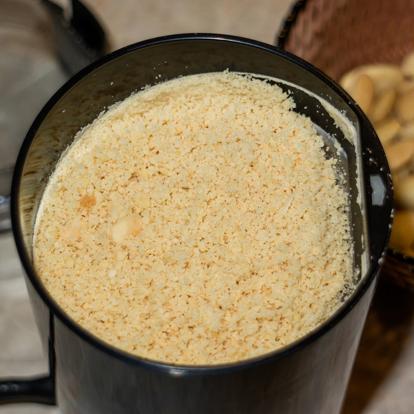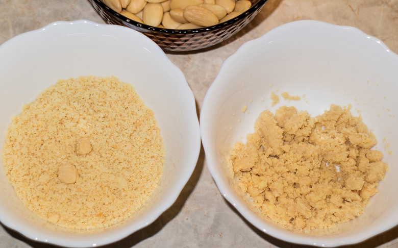 Результат получился значительно лучше: орехи совсем не спрессовались, легко высыпались в миску, помол мелкий, масса легкая, воздушная, хотя несколько крупных кусочков миндаля мы в массе все-таки встретили.