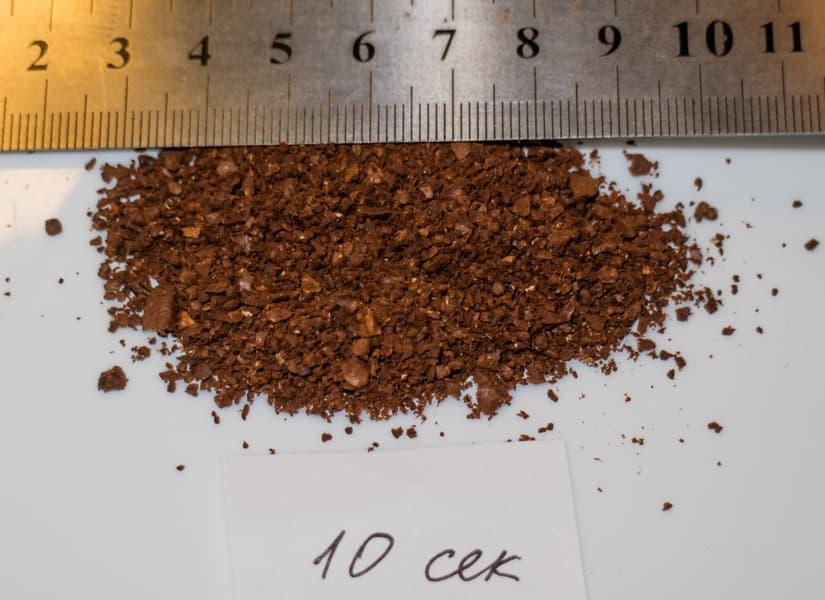 Мололи в течение 15 секунд. За это время зерна превратились в однородную мелко помолотую смесь. Даже потерев смесь между пальцами, мы не почувствовали в ней особо крупных частиц.