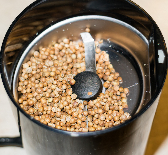 Данный тест продемонстрирует, как кофемолка справляется с помолом малого количества продукта. Две полные чайные ложки зерен насыпали в кофемолку. Обычные кухонные весы даже не отобразили вес кориандра.