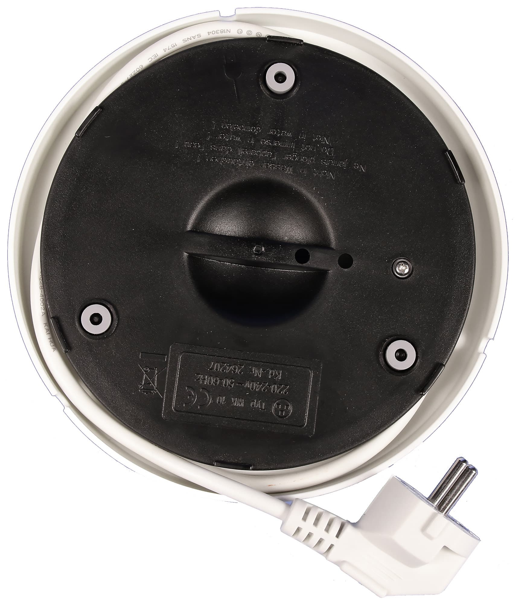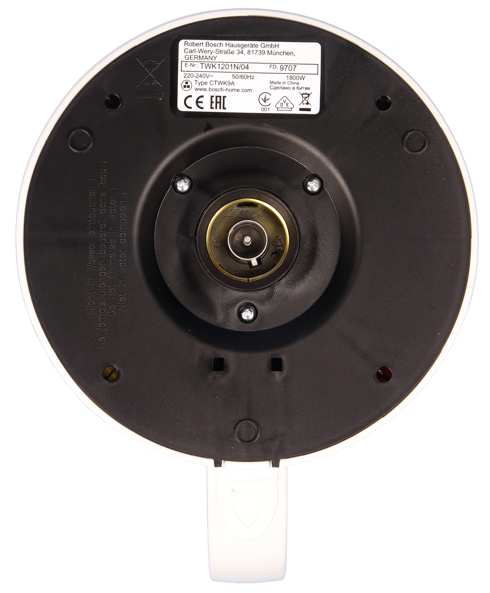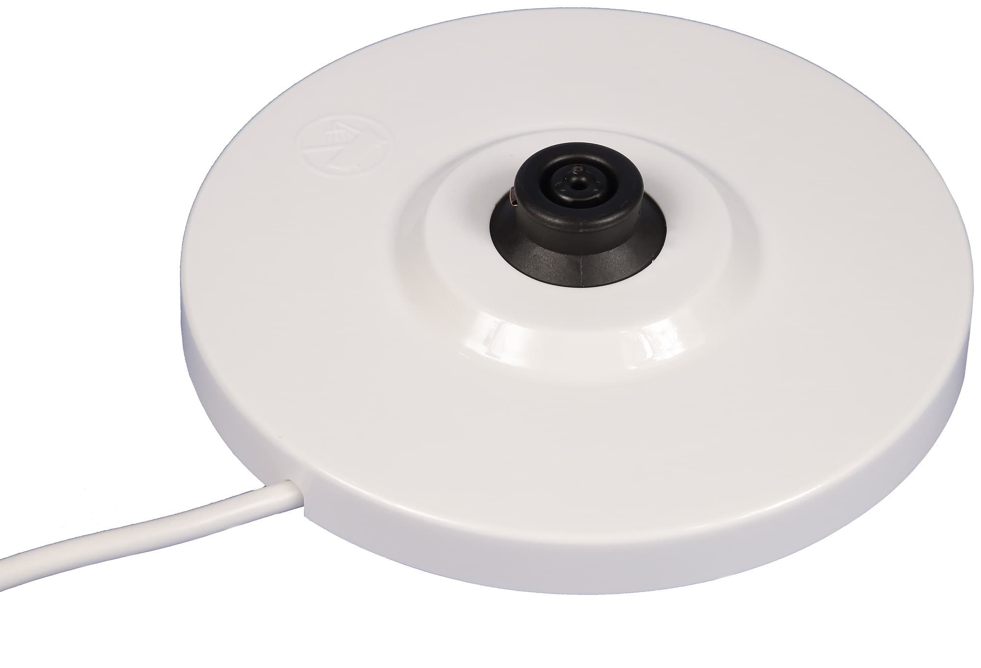Из такого же черного пластика сделано дно чайника, на котором расположена «ответная» контактная группа, состоящая из центрального штыря и двух концентрических колец. Рядом можно увидеть пластиковую подпружиненную кнопку, которая отключает чайник при снятии с базы. Выглядит вся конструкция довольно прочной. Также на дне чайника можно увидеть информационную наклейку и предупреждающие надписи.