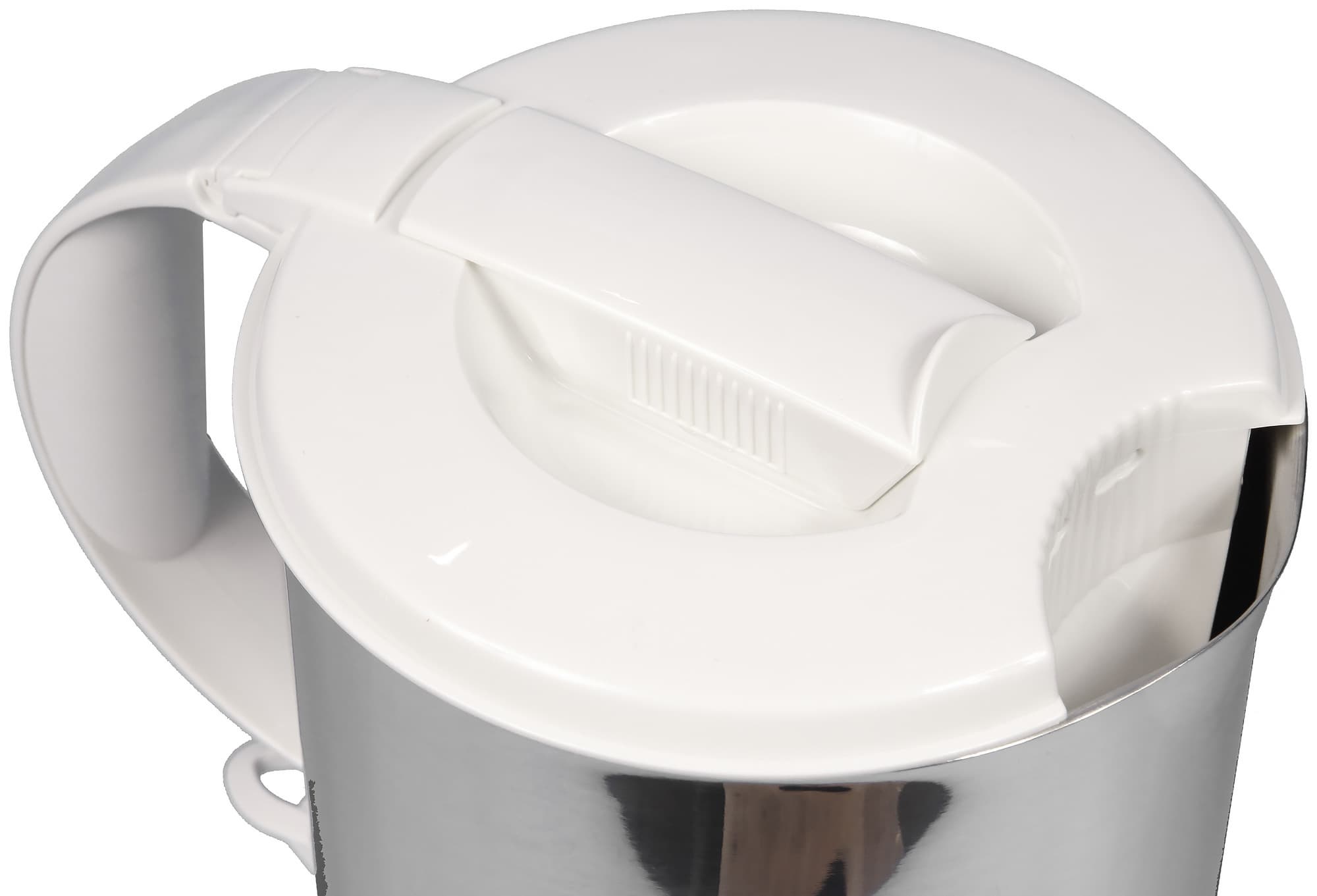 Несъемная крышка оснащена защелкой (она же — поперечная плашка, расположенная поперек крышки). Несмотря на качественный пластик, крышка может произвести впечатление болтающейся и хлипкой. Насколько это соответствует реальности, можно узнать лишь на собственном опыте (либо воспользовавшись опытом других пользователей). Изучив отзывы, мы выяснили, что крышка и в самом деле может сломаться (особенно при участии детей или при падении чайника), однако вряд ли это можно назвать массовой проблемой.