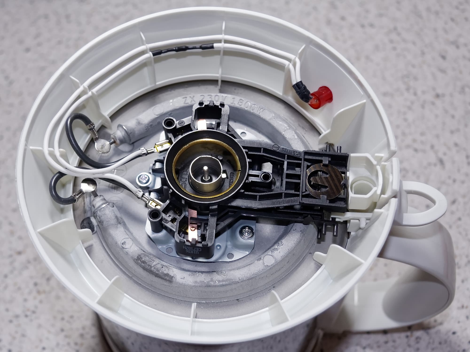 Разобрав чайник, можно убедиться, что его конструкция крайне проста: под крышкой находится нагревательный элемент в виде «подковы», светодиод (судя по всему, подключенный через резистор), и пластиковая подпружиненная система-качель, обеспечивающая работу рычага включения. Работа системы автоматического отключения обеспечивается при попадании достаточного количества горячего пара на биметаллическую пластину (пар поступает в нижнюю часть корпуса через полую ручку). Ломаться тут, и в самом деле, нечему.