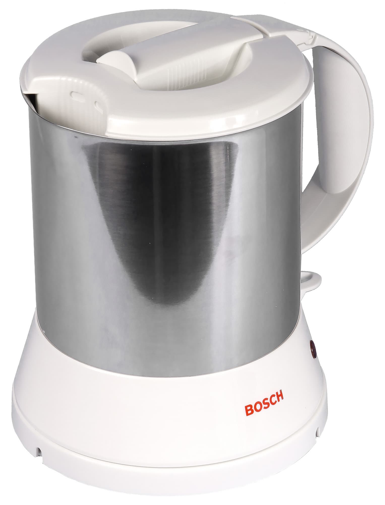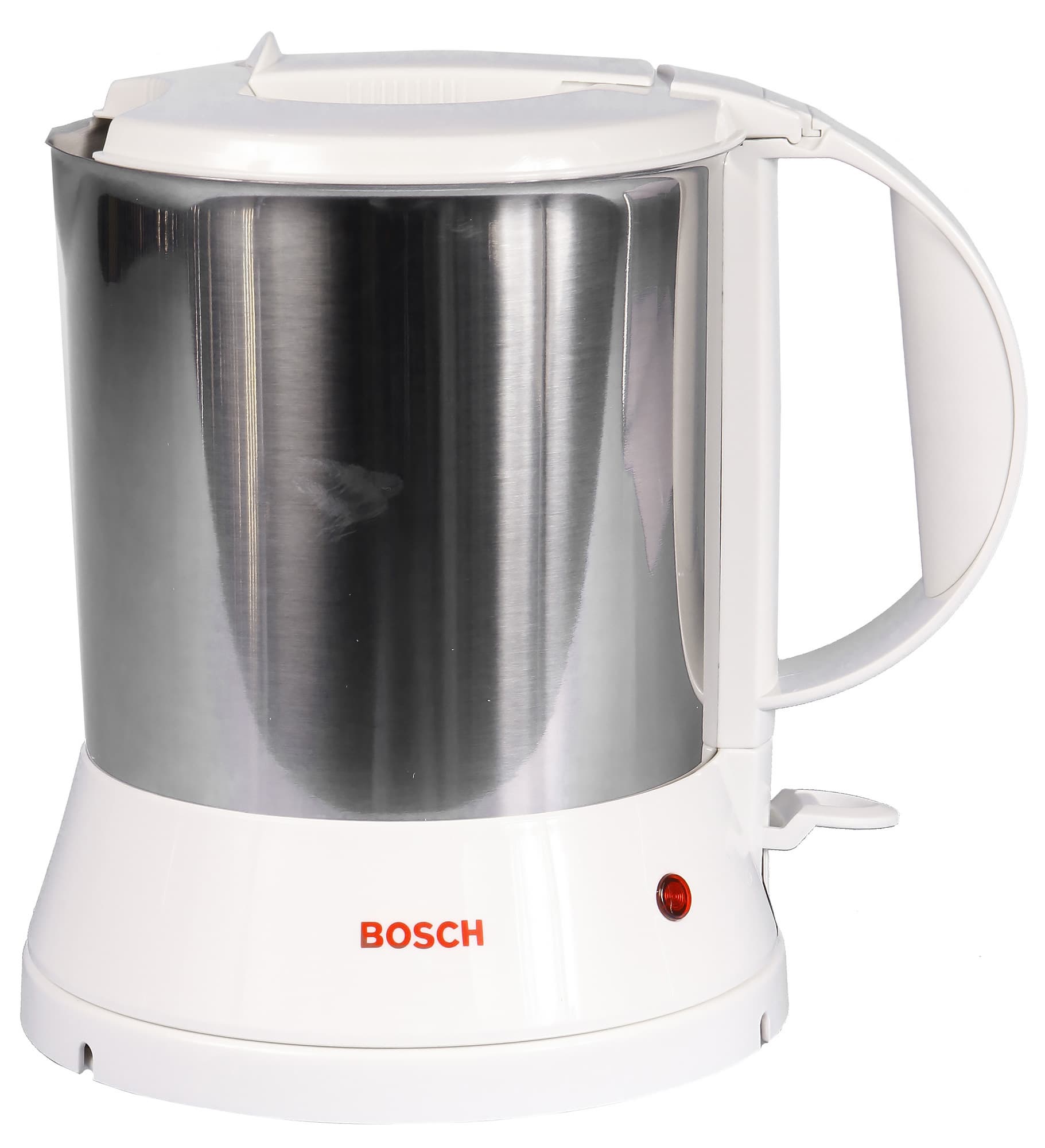 Крышка, ручка и основание чайника сделаны из белого глянцевого пластика. На основании можно увидеть красный логотип Bosch, красный индикатор работы и рычаг включения прибора со значками 0/I. Обращает на себя внимание тот факт, что для включения чайника рычажок нужно поднять вверх (а не опустить, как это принято у современных моделей).