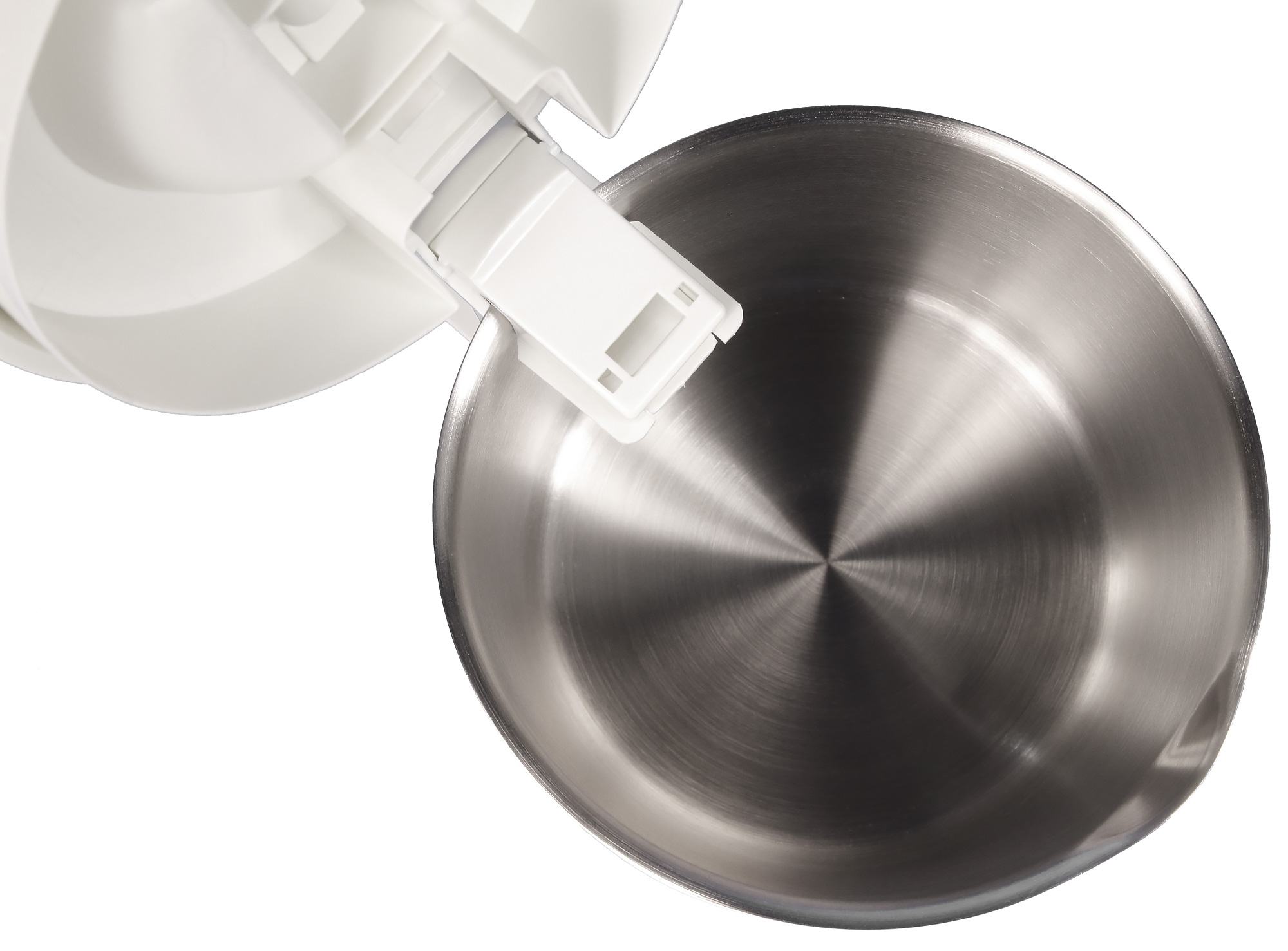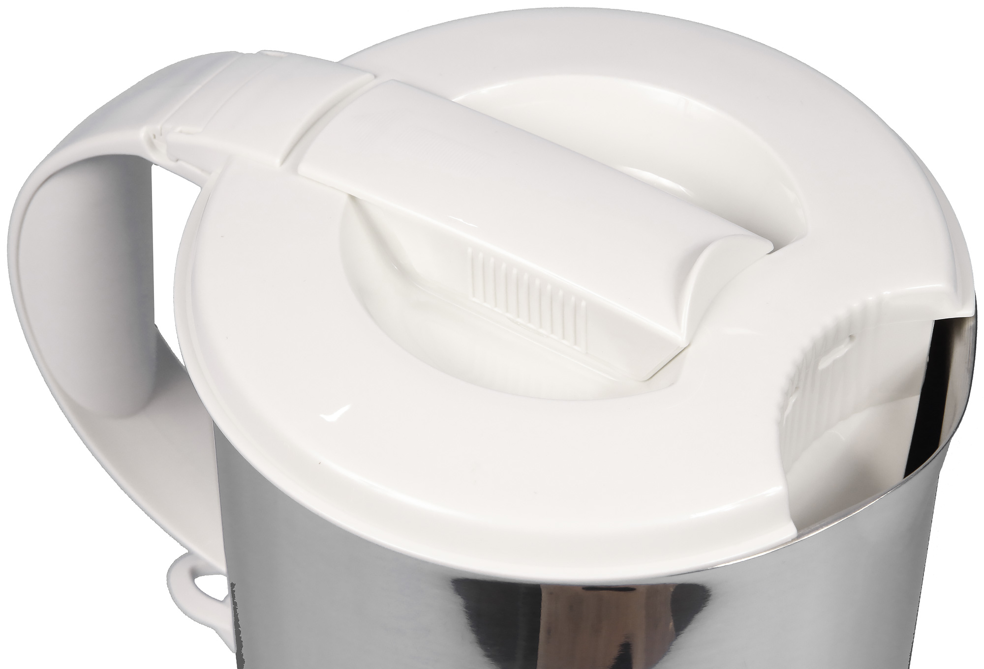 Второй характерный нюанс — устройство запирающего механизма крышки. Крышка не оснащена открывающей пружиной, а следовательно, ее придется открывать вручную. Чтобы разблокировать крышку, нужно сдвинуть рычажок-запор, расположенный по центру крышки, ухватиться за него и потянуть крышку вверх. Несмотря на наличие специальных ребер в зоне захвата, нам не удалось с ходу проделать это одной рукой. В общем, наш вердикт: чтобы открыть крышку, потребуется две руки (одна — чтобы придерживать чайник за ручку, вторая — чтобы собственно открыть крышку). Техника открывания крышки одной рукой доступна, но требует определенных тренировок. Зато у крышки предусмотрен фиксатор, удерживающий ее в открытом положении под углом более 90 градусов. Пользователю, таким образом, оказывается доступна вся колба с диаметром в 14,5 см. Получается, что чайник можно быстро наполнить водой из крана или из бутыли (струя может быть довольно большой) и так же быстро опустошить, резко наклонив при открытой крышке.