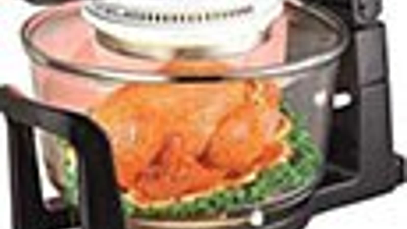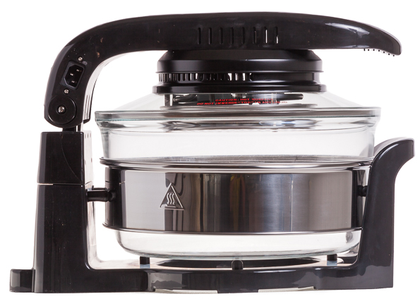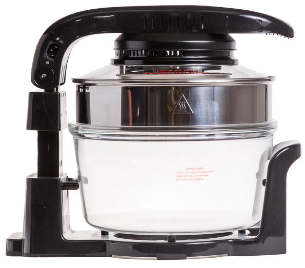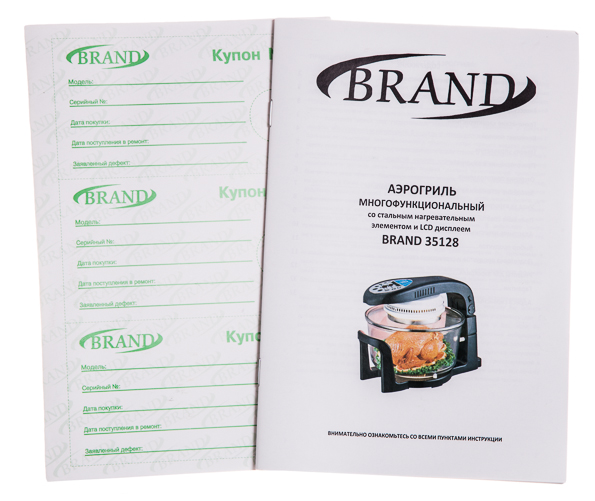 Этот прибор выполняет функции духового шкафа: в аэрогриле можно запекать овощи, фрукты и мясо, готовить выпечку, десерты и хлеб. Внешне модель выглядит как большая стеклянная кастрюля, увенчанная тяжелой крышкой с дисплеем. Пользователь может выставить нужное время и температуру приготовления и уровень конвекции. В комплекте с аэрогрилем прилагаются низкая и высокая решетки для продуктов, противень для жарки, шампуры и щипцы для извлечения решеток. Еще у модели есть расширительное кольцо, увеличивающее полезный объем чаши. У Brand 35128 есть 10 автоматических программ для приготовления различных блюд. В инструкции приведены рецепты, адаптированные для аэрогриля.