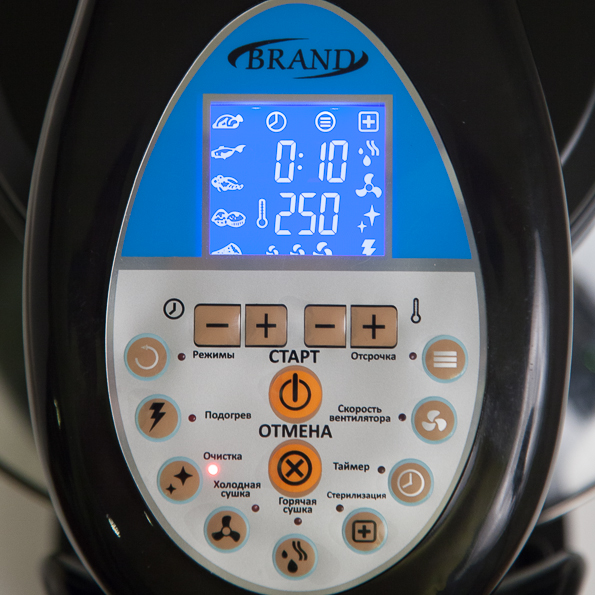 Чтобы запустить автоматический режим, надо нажать кнопку с его обозначением. В автоматических режимах можно изменять все параметры: температуру, время, уровень обдува. Минимальная возможная температура — 50 °C, максимальная — 250 °C, минимально возможное время — 1 минута, максимально возможное — 1 час 59 минут. Впрочем, если вам нужно готовить блюдо дольше двух часов, вы можете просто запустить новый рабочий цикл по окончании предыдущего.